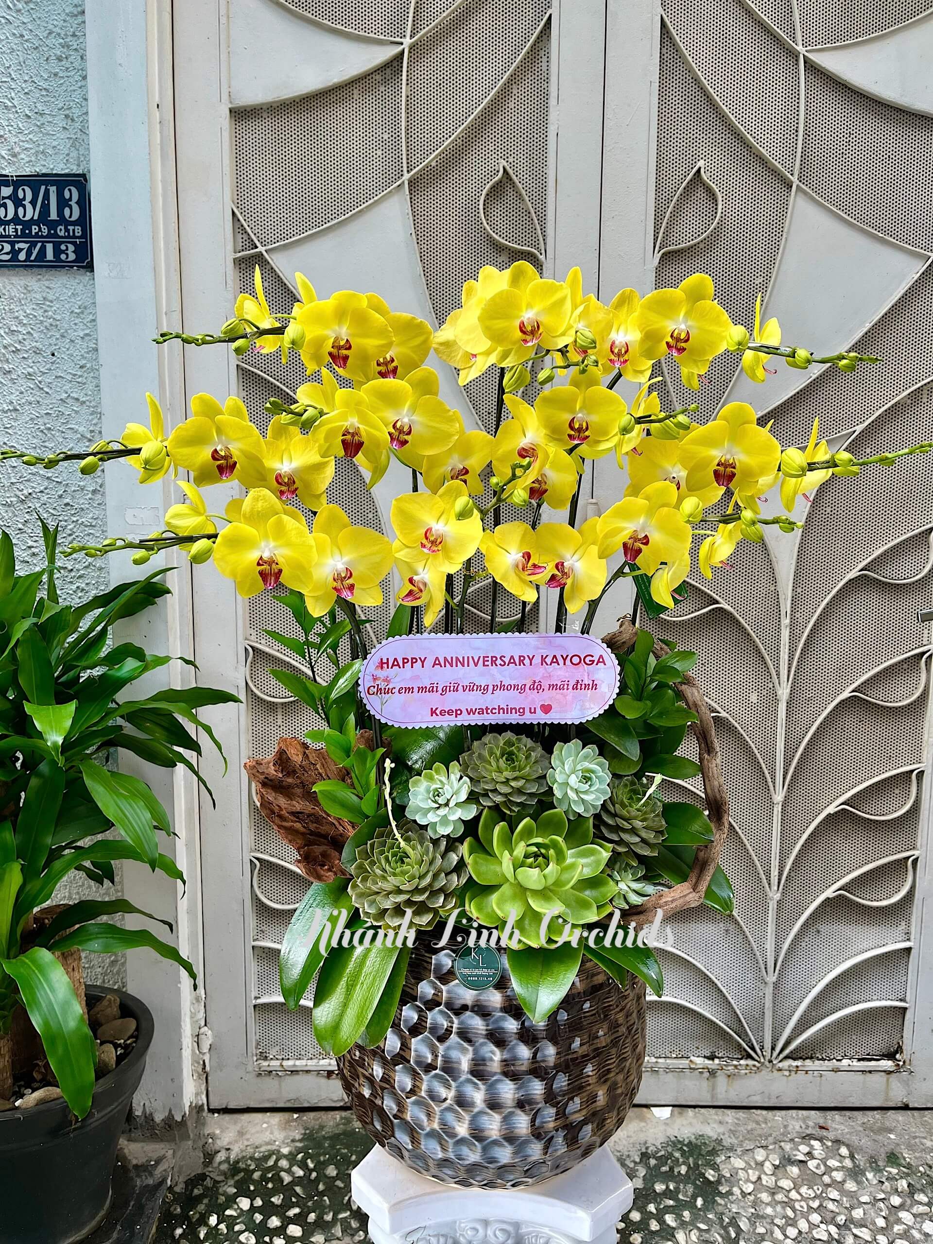 Sen đá được tinh tế tích hợp vào trang trí, làm nổi bật vẻ cổ điển và truyền thống trong thiết kế. Những chi tiết sen đá được đặt một cách linh hoạt và tự nhiên, tạo nên sự thoải mái và ấm cúng. Sự tương phản giữa vẻ lạnh lùng của đá và sự tươi mới của hoa Lan Hồ Điệp tạo nên một hiệu ứng hấp dẫn và độc đáo. Chậu hoa Lan Hồ Điệp Vàng A42 10 Cành với trang trí sen đá không chỉ là một phụ kiện trang trí nội thất mà còn là biểu tượng của sự thanh lịch và tinh tế, tạo nên không gian sống đẳng cấp và đầy ấn tượng.