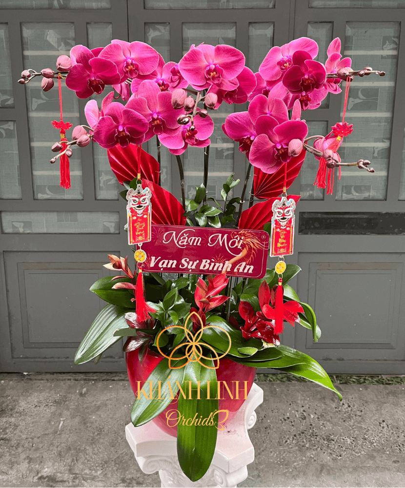 Hoa lan hồ điệp Cam Sen 5 Cành là một tác phẩm thiên nhiên tuyệt vời, khiến mọi người không thể rời mắt khỏi vẻ đẹp tinh tế và quyến rũ của nó. Mỗi cành hoa lan hồ điệp mang đến sự kiêu sa và quý phái, với những đóa hoa đỏ tươi rực rỡ, tạo nên một bức tranh sống động rực rỡ vào những ngày xuân. Mỗi cành hoa được chăm sóc kỹ lưỡng, từ hình dáng, màu sắc đến cả vẻ uy nghiêm trong từng đường nét của hoa và cành. Đỏ Sen, màu sắc của sự giàu có và may mắn trong văn hóa phương Đông, luôn là lựa chọn số 1 trong lòng khách hàng mỗi độ xuân về. Khi nhìn vào chậu hoa này, người ta có cảm giác như được đưa vào một khu vườn hoa nở rộ, với mỗi bông hoa như là một ngôi sao sáng rực trên bầu trời.