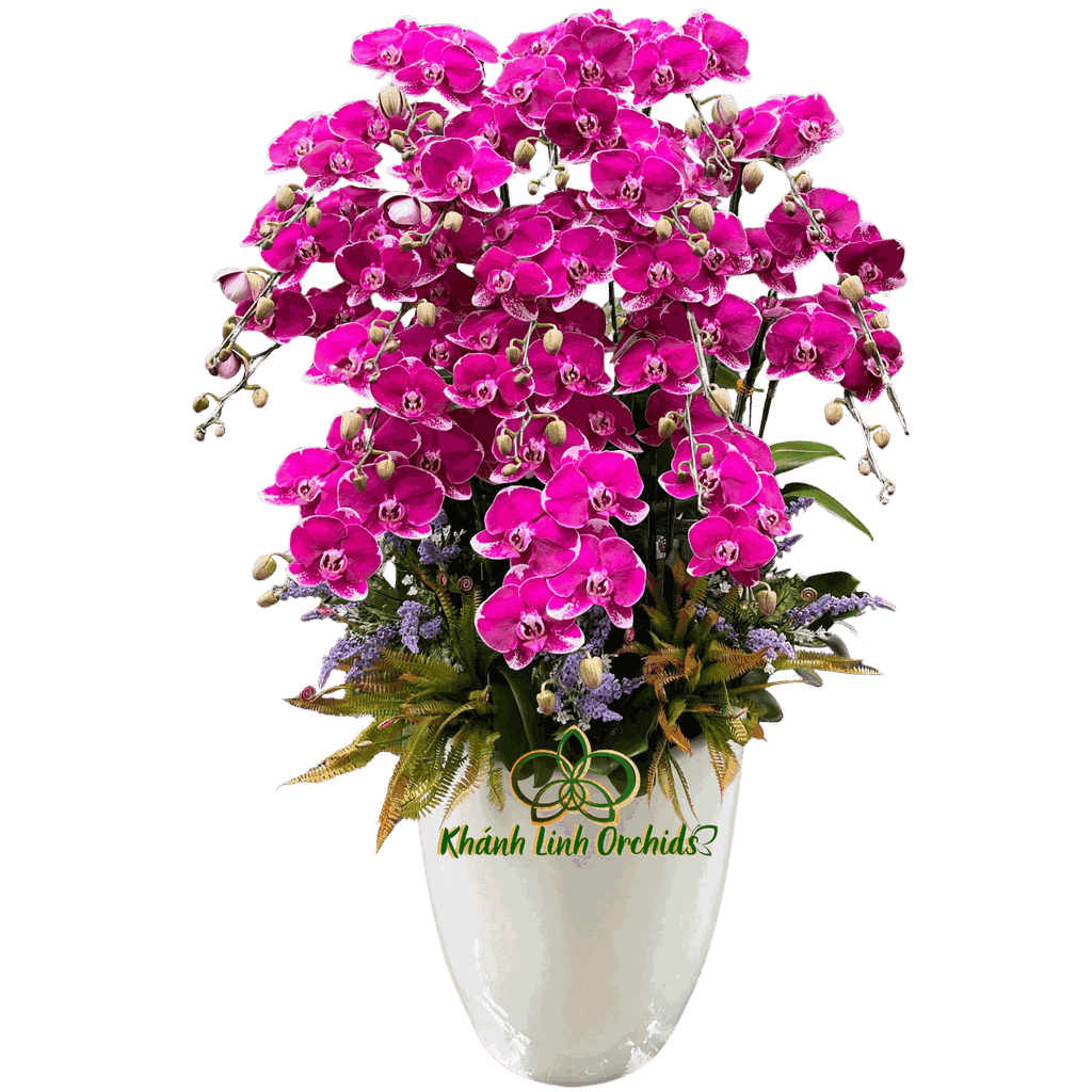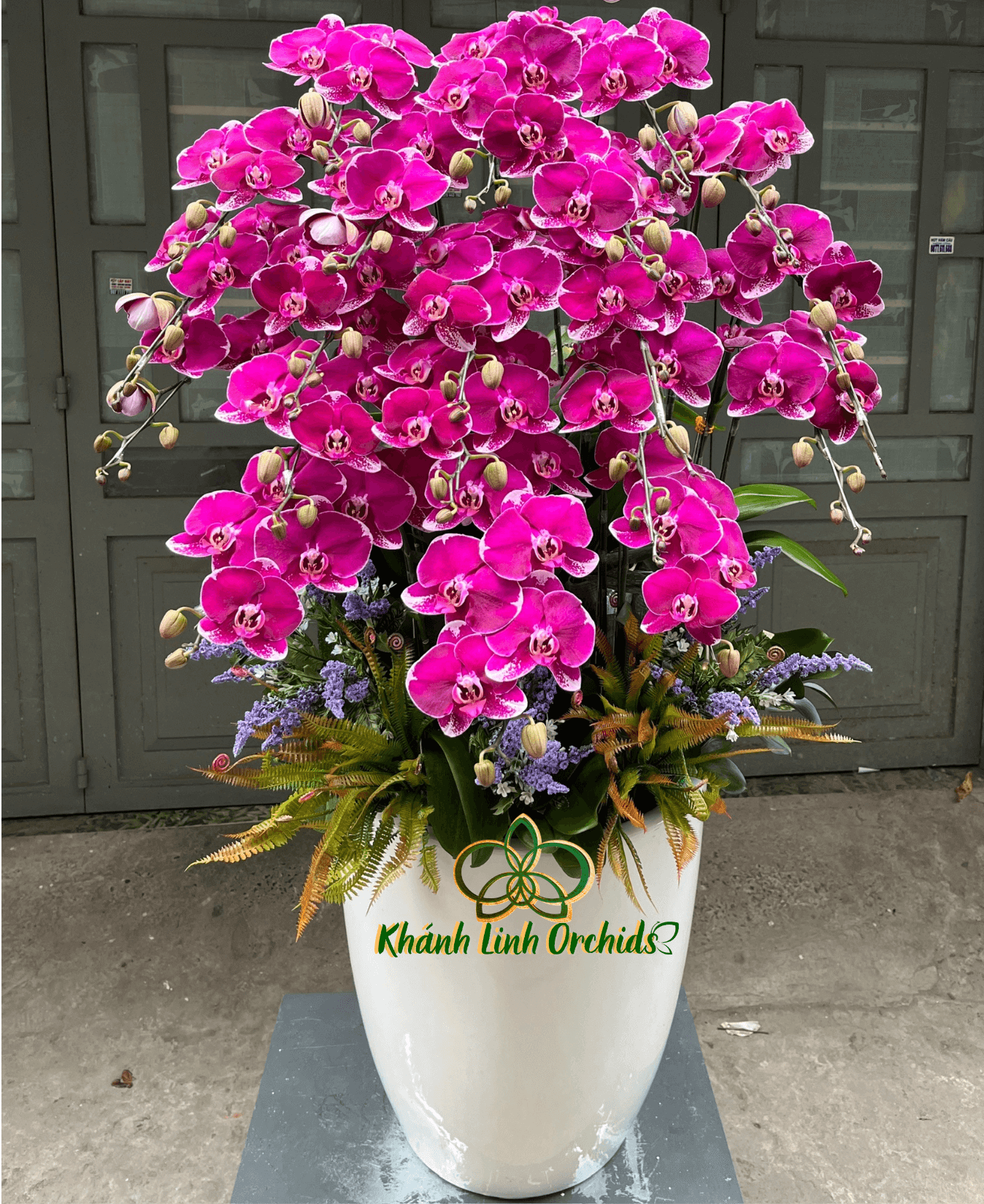 Chậu lan hồ điệp tím đột biến 20 cành thu hút ánh nhìn ngay từ khoảnh khắc đầu tiên. Sắc tím đậm quý phái kết hợp đường viền trắng thanh nhẹ trên mỗi cánh hoa tạo nên vẻ đẹp nổi bật, sang trọng và đầy cuốn hút. Những cành lan khỏe mạnh, vươn dài, được tuyển chọn kỹ càng và bố trí theo bố cục tầng lớp hài hòa, mang đến tổng thể đầy đặn nhưng vẫn giữ được sự mềm mại đặc trưng của lan hồ điệp đột biến.
