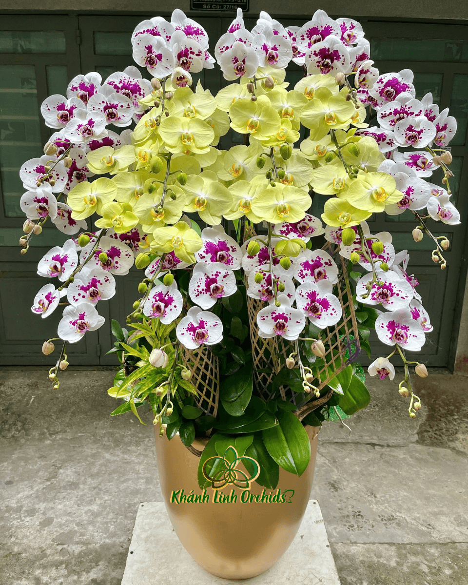Mười tám cành lan được cắm khéo léo trong chậu cao phun vàng nổi bật, tạo cảm giác sang trọng và quý phái. Trang trí bằng tre đan mộc mạc và lá trúc xanh tươi, chậu hoa mang đến sự hòa quyện hài hòa giữa thiên nhiên và nghệ thuật sắp đặt. Đây là món quà hoàn hảo để gửi tặng trong những dịp đặc biệt hoặc trưng bày tại không gian sống, văn phòng để mang lại cảm giác thư thái, may mắn và một tinh thần luôn tươi mới, tràn đầy năng lượng.