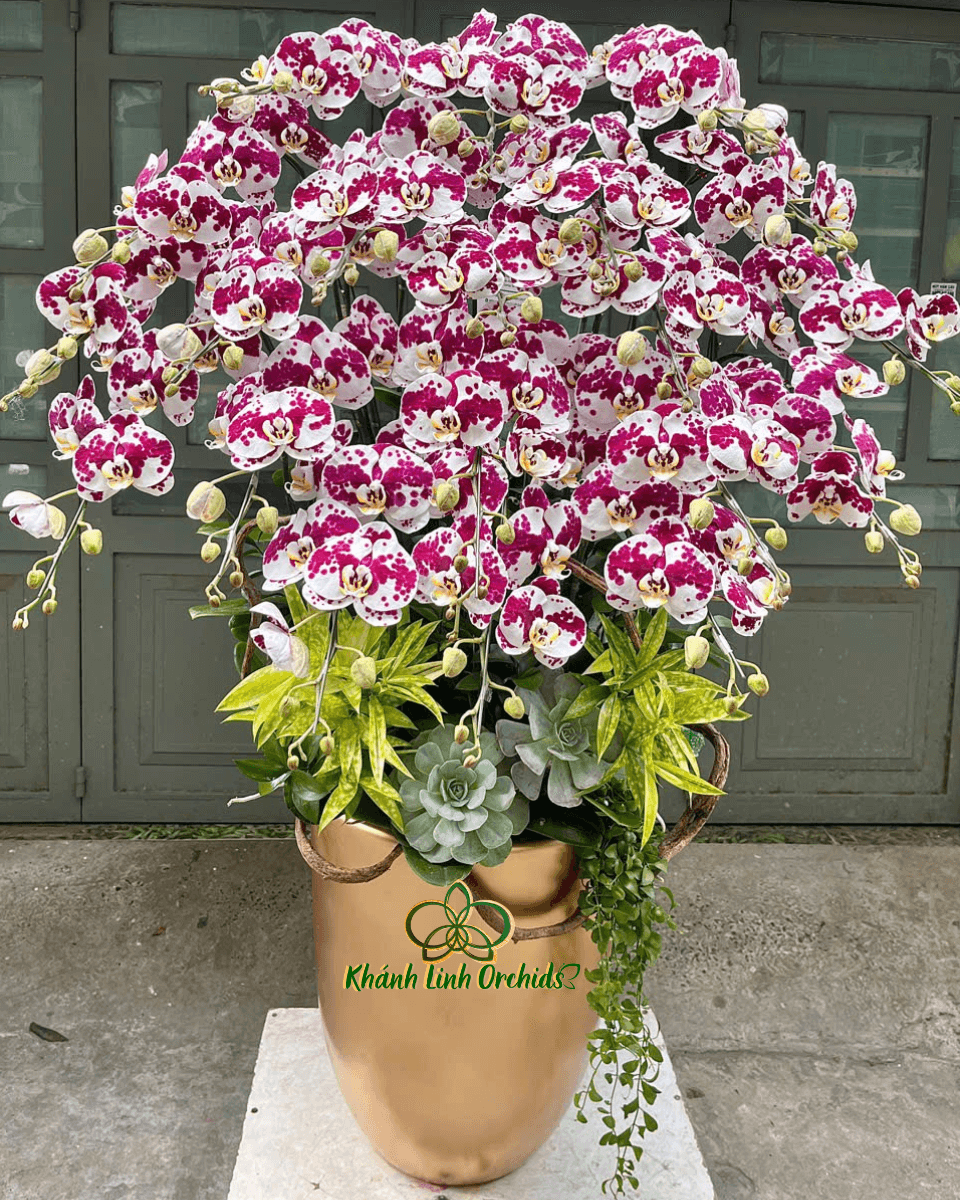 Chậu lan hồ điệp bò sữa 20 cành được thiết kế trong dáng chậu sứ cao phun vàng sang trọng, là sự kết hợp tinh tế giữa nghệ thuật cắm hoa hiện đại và ý nghĩa phong thủy sâu sắc. Những cánh lan trắng điểm hồng tím nổi bật, tựa như họa tiết bò sữa độc đáo, tạo hiệu ứng thị giác cuốn hút và mang lại cảm giác tươi mới, đầy sức sống. Hoa được bố trí khéo léo theo tầng lớp uyển chuyển, mềm mại, như những dải lụa buông rủ nhẹ nhàng, gợi nên sự thanh thoát và quyến rũ.