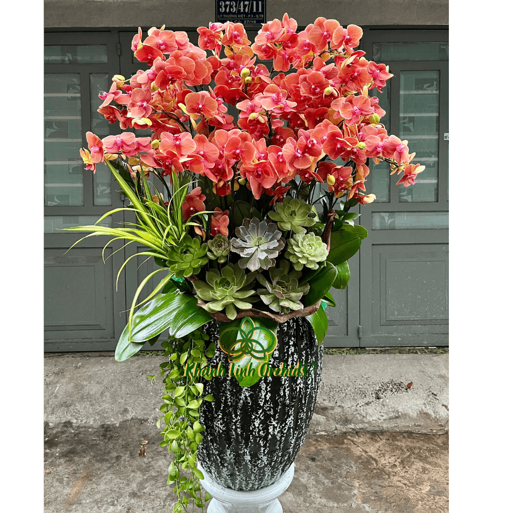 Chậu hoa được cắm trong chậu composite đen sang trọng, tạo ra sự tương phản tinh tế với màu cam của hoa. Màu đen không chỉ làm nổi bật vẻ đẹp của những cành lan mà còn thêm phần thanh lịch và hiện đại cho tổng thể. Sự kết hợp này tạo nên một hiệu ứng thị giác mạnh mẽ, mang lại cảm giác vừa sang trọng vừa gần gũi.