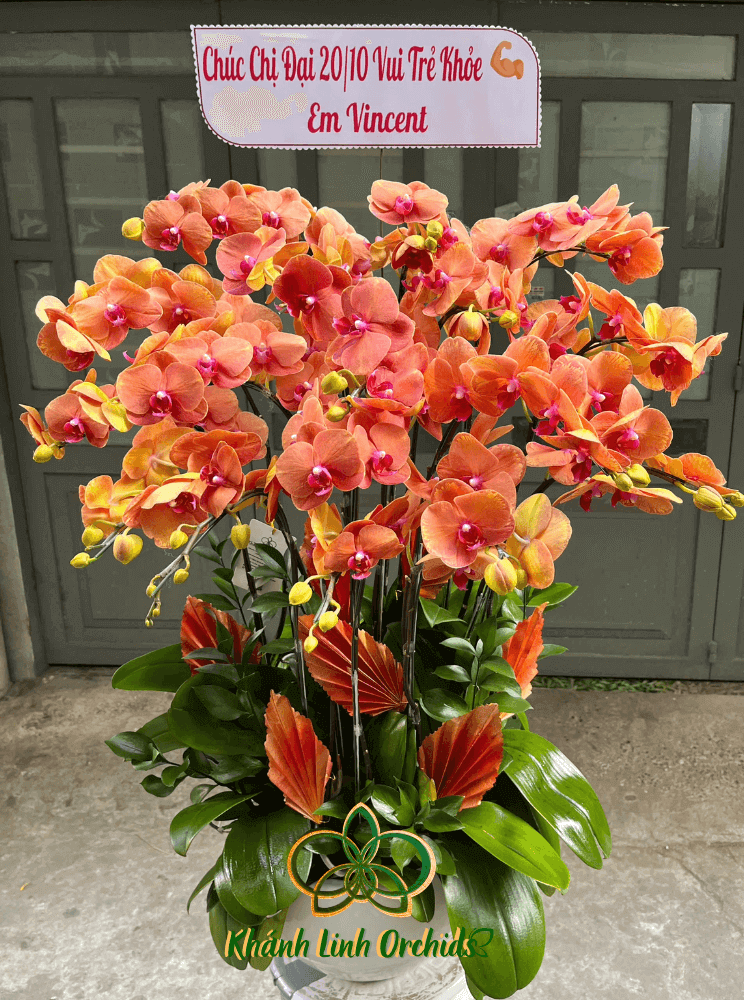 Chậu hoa Lan Hồ Điệp cam 8 gốc, mỗi gốc hai vòi, với tổng 16 nhánh lan rực rỡ là sự lựa chọn thông minh và tinh tế. Việc chọn lan Hồ Điệp 2 vòi mang lại không chỉ sự tiết kiệm chi phí mà còn cho chậu hoa nét dày dặn, tròn đầy mà vẫn uyển chuyển, nổi bật.