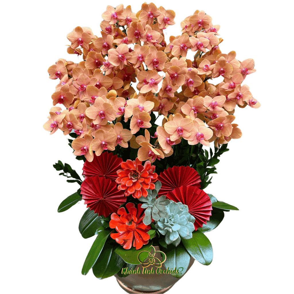 Được bố trí khéo léo trong chậu sứ cao ánh vàng sang trọng, tổng thể chậu hoa mang hình dáng vững chãi, cân đối – thể hiện sự phát triển bền vững, thành công viên mãn. Phần tiểu cảnh bên dưới được tô điểm bằng sen đá xanh mát, hoa đỏ rực và phụ kiện quạt giấy xếp tone đỏ đô, tạo chiều sâu và điểm nhấn ấn tượng, vừa hiện đại vừa mang ý nghĩa phong thủy: tụ tài – tụ lộc – khai vận.