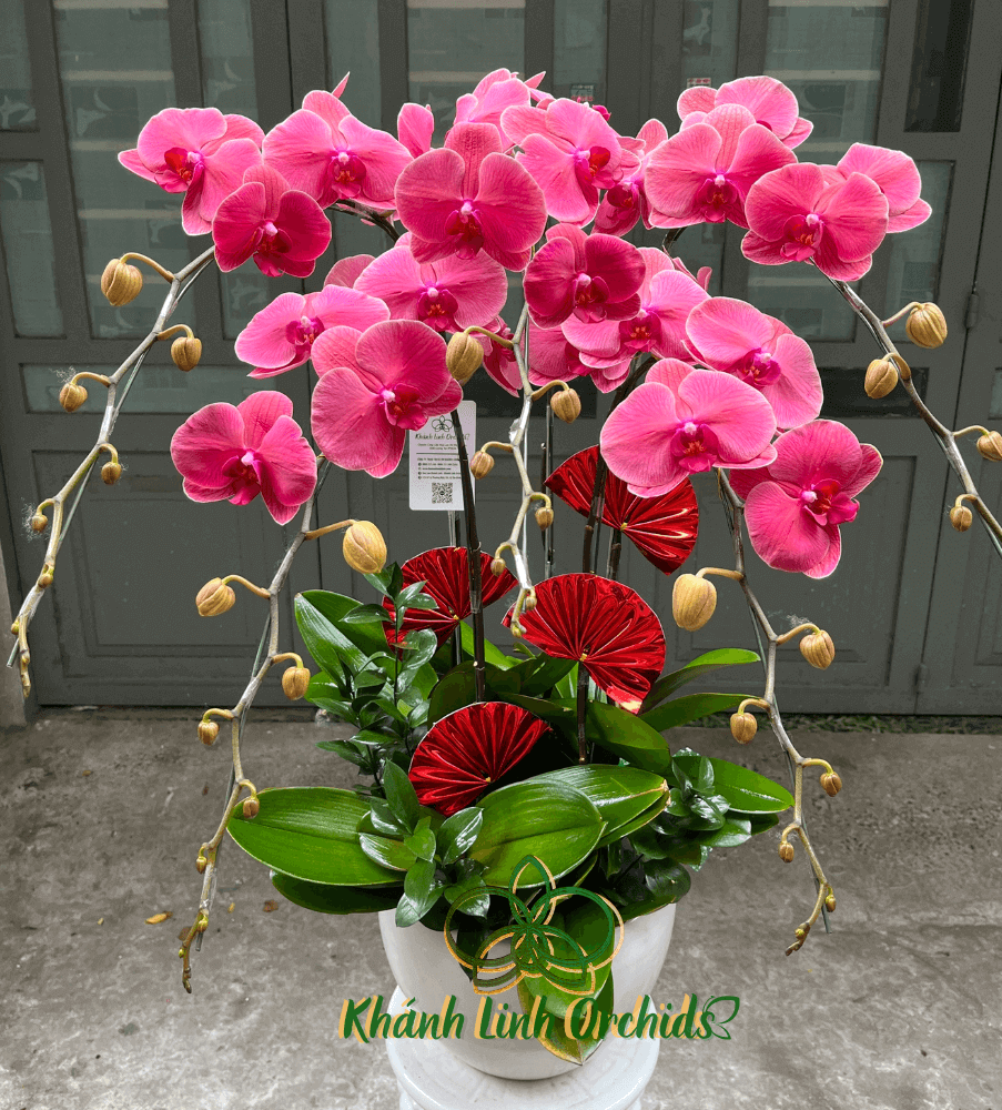 Kết hợp với màu xanh của những chiếc lá bóng bẩy, khỏe mạnh, chậu hoa lan trở thành một tác phẩm hoàn mỹ, nổi bật và sang trọng. Sự hài hòa giữa sắc đỏ, cam và xanh khiến chậu hoa phù hợp với mọi không gian, từ phòng khách, bàn làm việc cho đến những dịp trưng bày sang trọng, mang đến không gian cảm giác ấm áp và tràn đầy năng lượng.