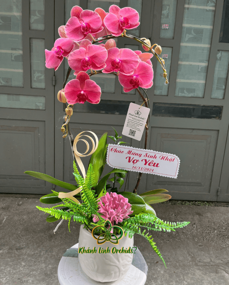 Chậu hoa được cắm trong một chiếc chậu trắng nhỏ xinh, với chiều cao 80cm đến 90cm, tạo nên sự tương phản hoàn hảo, làm nổi bật lên vẻ đẹp của Lan Hồ Điệp. Đặc biệt, phần trang trí thêm sen đá phun màu hồng đỏ nhẹ nhàng và lá xanh tươi mát xung quanh làm tăng thêm sự sinh động và hài hòa cho tổng thể.