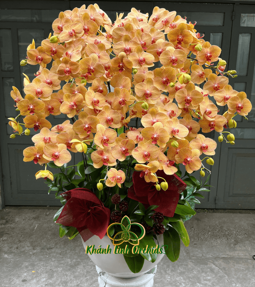Chiều cao tổng thể của chậu hoa đạt khoảng 1m2-1m3, tạo nên một điểm nhấn thanh lịch nhưng đầy ấn tượng. Đặc biệt, hai nơ đỏ bằng lưới được trang trí khéo léo trên chậu hoa , làm nổi bật thêm vẻ đẹp sang trọng, quý phái của tổng thể. Màu cam của hoa kết hợp hoàn hảo với sự tinh khiết của chậu sứ trắng và nét nổi bật của các nơ đỏ, tạo nên một tác phẩm nghệ thuật đầy ấn tượng, phù hợp cho các dịp trang trọng như lễ hội, tặng quà hay trang trí nội thất.