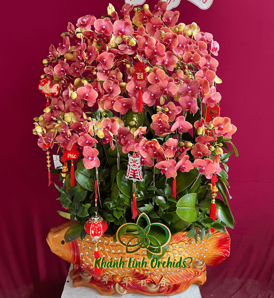 Chậu hoa Lan Hồ Điệp Cam Tắc 16 Gốc 2 Vòi được cắm trong một chậu con cá chép đính đá sang trọng, làm tôn lên vẻ đẹp quý phái và nổi bật của hoa. Chậu con cá chép mang ý nghĩa may mắn và tài lộc, kết hợp với những viên đá lấp lánh, làm tăng thêm sự sang trọng, cuốn hút cho chậu hoa. Với chiều cao tổng thể khoảng 1m1, chậu hoa mang đến sự cân đối và hài hòa cho không gian, trở thành điểm nhấn nổi bật trong bất kỳ không gian nào. Để che đi những gốc lan, chậu hoa còn được trang trí với những lá xanh mướt mát, tạo cảm giác tự nhiên và tươi mới, đồng thời làm nổi bật sắc cam của hoa. Sự kết hợp giữa hoa Lan Hồ Điệp cam tươi sáng, chậu cá chép sang trọng, liễng Tết và lá xanh không chỉ mang lại một không gian tươi mới mà còn thể hiện sự cầu chúc tài lộc, may mắn cho gia đình trong những dịp lễ trọng đại như ngày Tết.