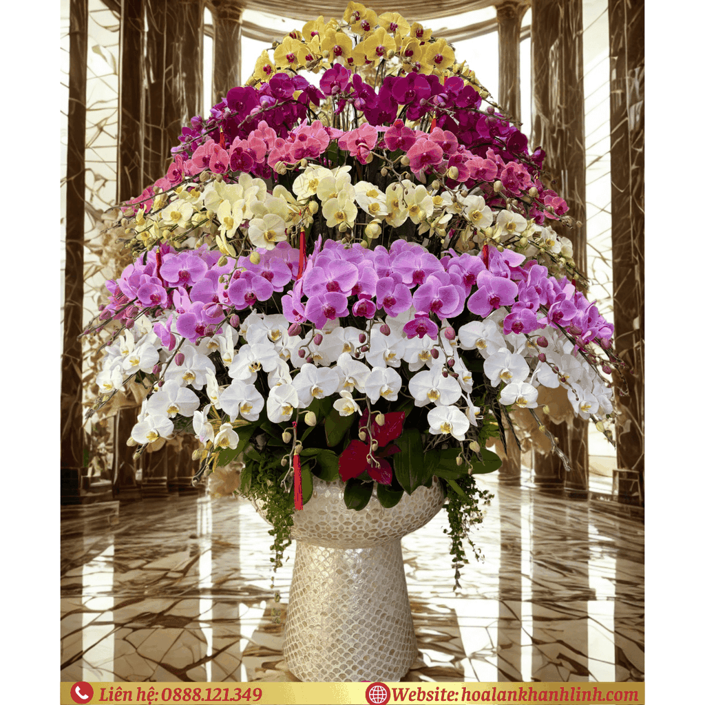 Chậu lan hồ điệp đa sắc 150 cành phối 6 màu là sự lựa chọn hoàn hảo cho những không gian lớn, sang trọng như sảnh khách sạn, trung tâm hội nghị, biệt thự cao cấp hay showroom doanh nghiệp. Không chỉ đơn thuần là một tác phẩm hoa, đây là biểu tượng của sự thịnh vượng, phát triển và đẳng cấp vượt trội.