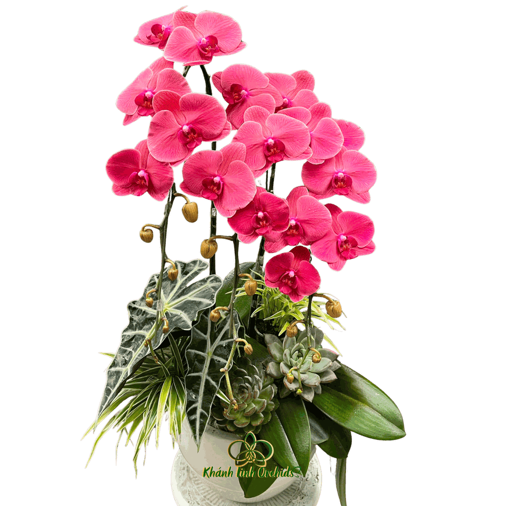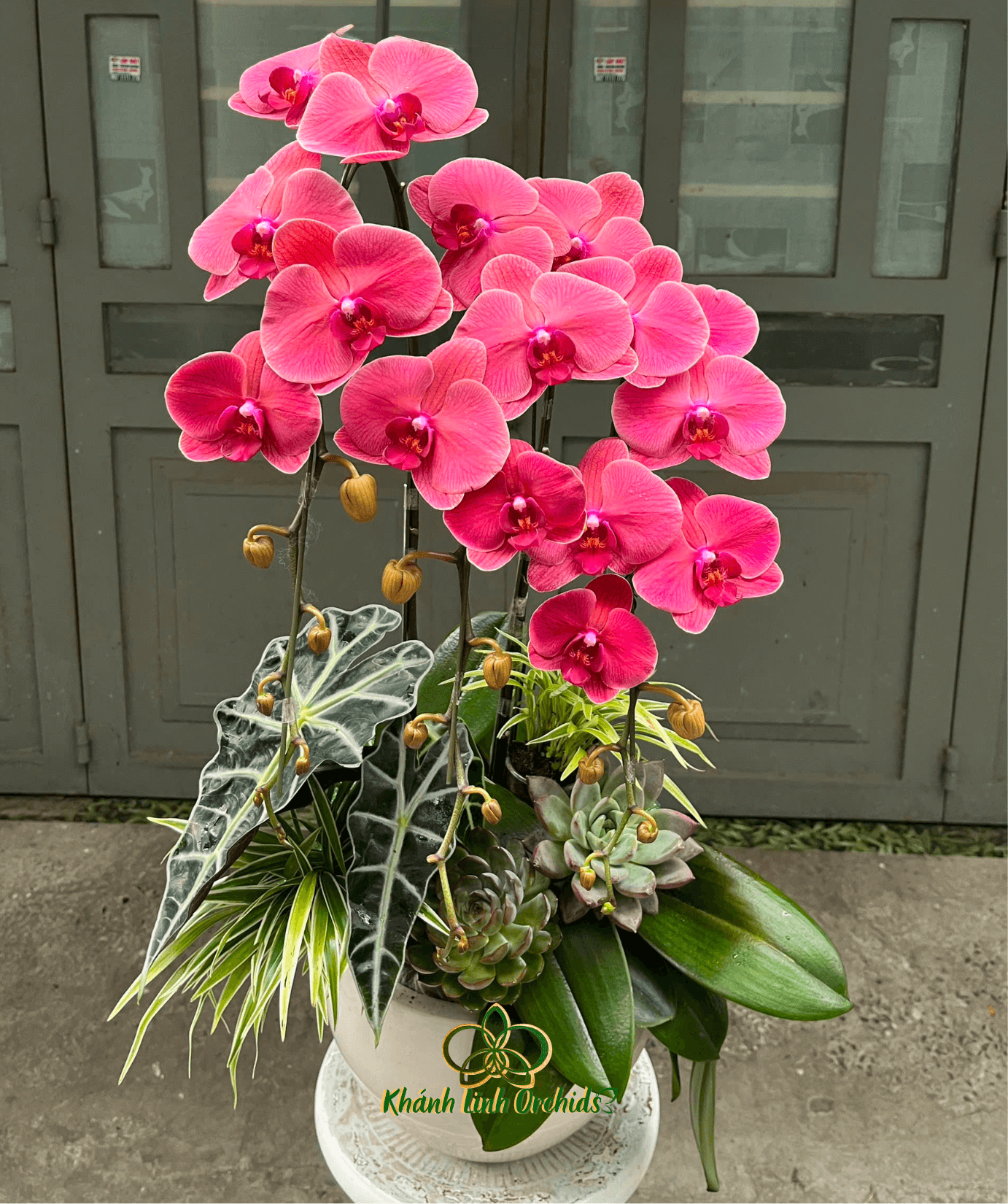 Chậu hoa được điểm xuyết bằng sen đá, lá cảnh Alocasia và các chi tiết xanh tươi giúp tổng thể thêm phần sinh động và hiện đại, phù hợp để trang trí trong phòng khách, sảnh công ty hoặc làm quà tặng tinh tế.