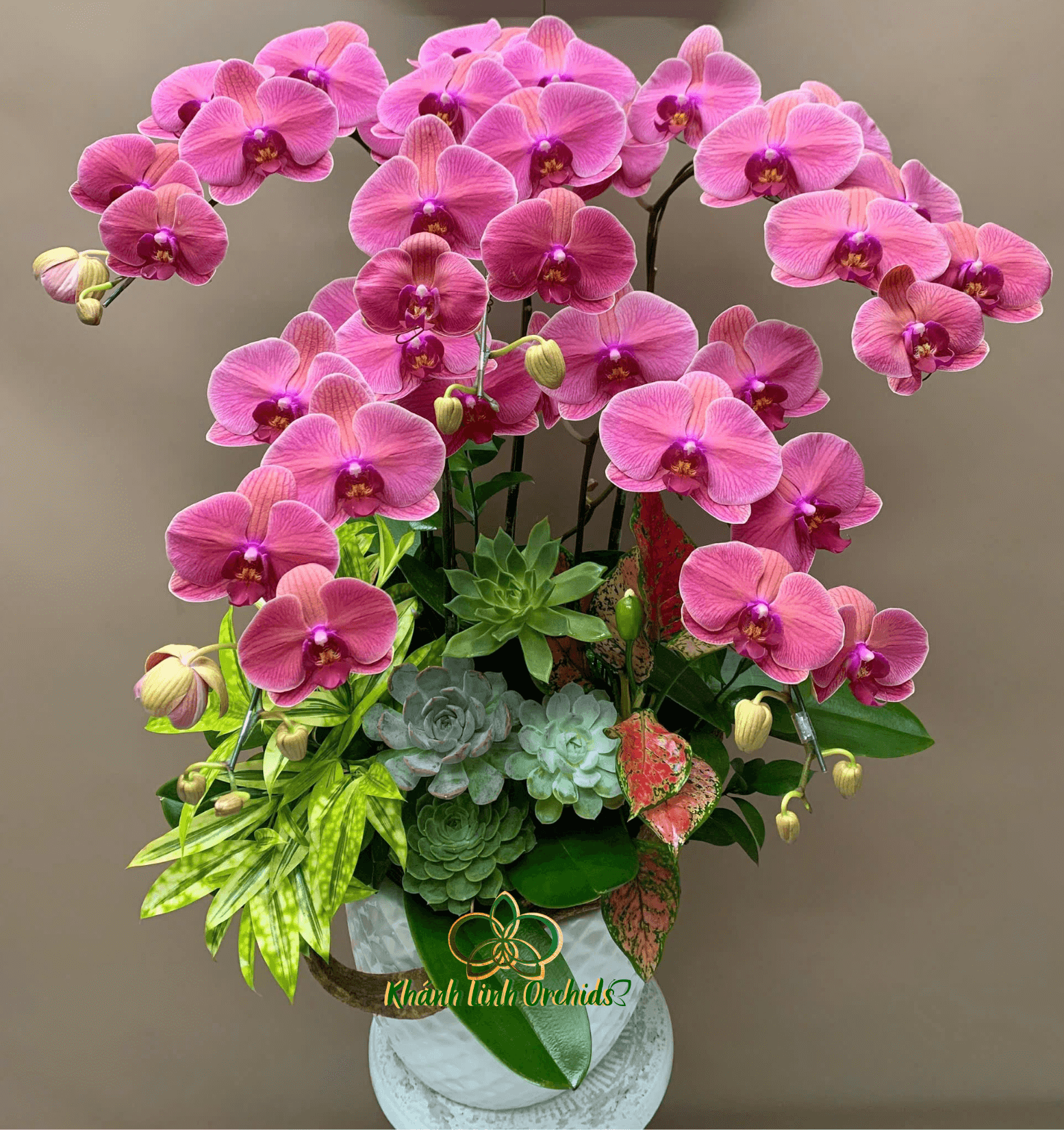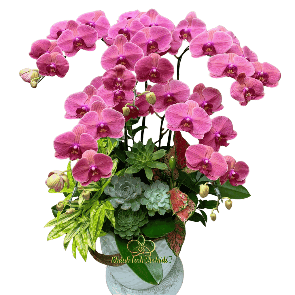Chậu hoa được thiết kế gọn gàng nhưng tinh tế, gồm 5 cành lan được sắp xếp cân đối trong bình gốm trắng cao cấp. Điểm nhấn thêm là lá xanh, sen đá và tiểu cảnh nhỏ xinh, tạo nên tổng thể hài hòa, vừa hiện đại vừa gần gũi. Vẻ đẹp rực rỡ của lan hồ điệp đỏ cam không chỉ thu hút ánh nhìn mà còn mang nhiều ý nghĩa phong thủy: tượng trưng cho tài lộc, thịnh vượng, tình yêu nồng cháy và niềm vui trọn vẹn.
