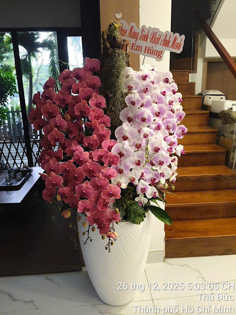 Về ý nghĩa, lan hồ điệp đỏ cam tượng trưng cho năng lượng tích cực, sự nhiệt huyết, thành công và may mắn trong công việc cũng như cuộc sống. Sắc trắng phớt hồng lại mang thông điệp của sự tinh khôi, nhẹ nhàng, gắn kết và yêu thương. Khi kết hợp trong cùng một chậu lan 25 cành, tác phẩm hoa không chỉ thể hiện sự sung túc, viên mãn mà còn gửi gắm lời chúc về khởi đầu thuận lợi, tài lộc dồi dào và các mối quan hệ hài hòa, bền vững.