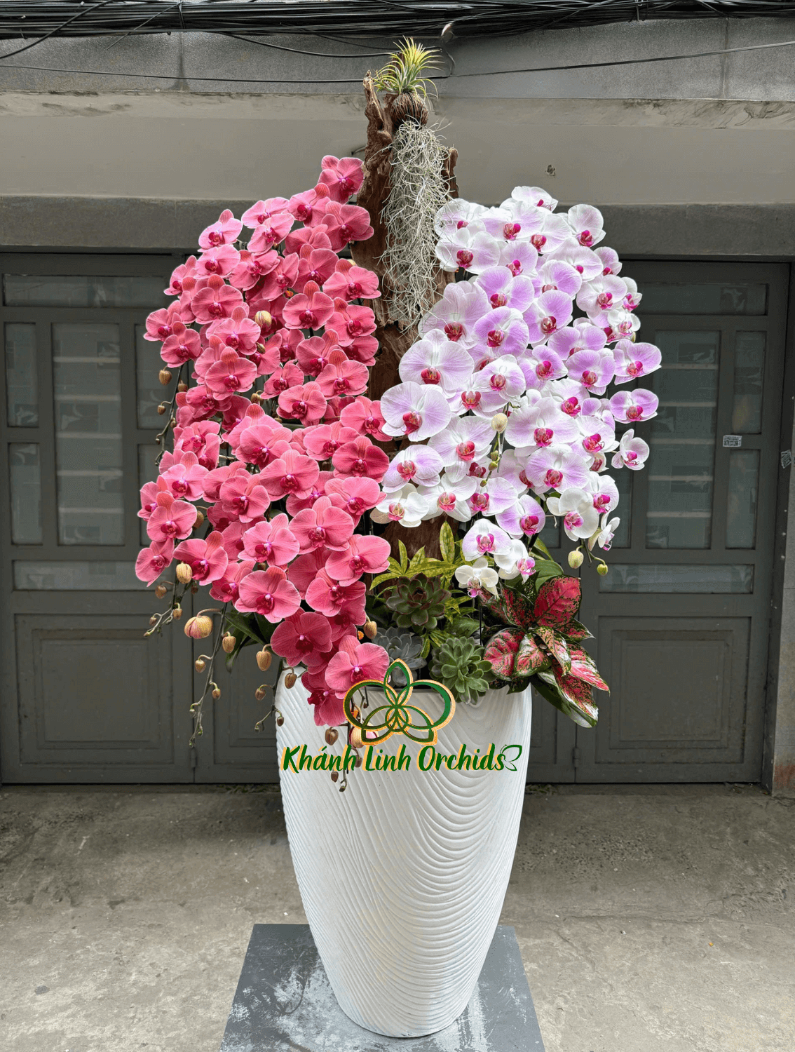 Điểm nhấn đặc biệt của chậu lan nằm ở phần gỗ trang trí chính giữa, mang dáng vẻ mộc mạc nhưng mạnh mẽ, tạo trục đứng vững chắc cho tổng thể. Gỗ kết hợp cùng sen đá và các loại lá cảnh xanh mướt được bố trí khéo léo phía chân chậu, giúp tổng thể thêm sinh động, tự nhiên và có sự chuyển tiếp hài hòa giữa hoa và nền. Chậu xi măng trắng họa tiết với đường nét tinh giản, hiện đại không chỉ tôn lên vẻ đẹp của lan mà còn phù hợp với nhiều không gian trưng bày như sảnh công ty, phòng khách, showroom hay không gian sang trọng dịp lễ, Tết.