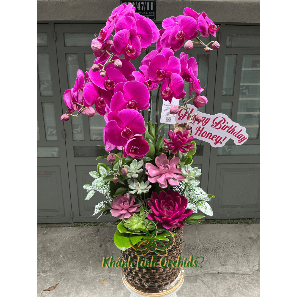 Chậu hoa trở nên hoàn hảo hơn khi được kết hợp với sen đá phun màu tươi mới, tạo nên sự cân bằng giữa sự mềm mại của lan và sự vững chãi, bền bỉ của sen đá. Những chậu sen đá nhỏ xinh với sắc màu tươi sáng không chỉ làm nổi bật thêm màu sắc của lan hồ điệp mà còn tạo nên một điểm nhấn thú vị, mang đến sự tươi mới và đầy sức sống cho chậu hoa.