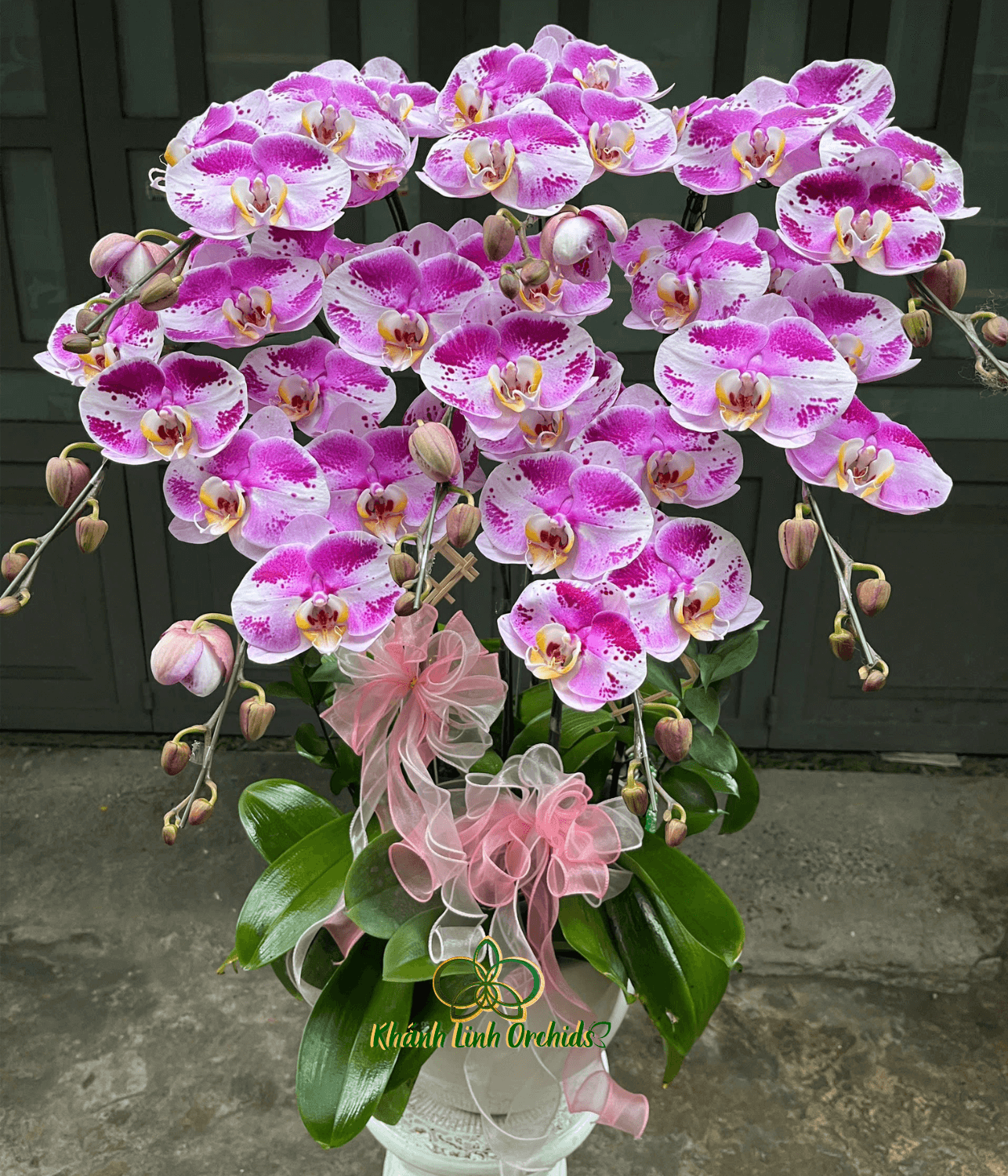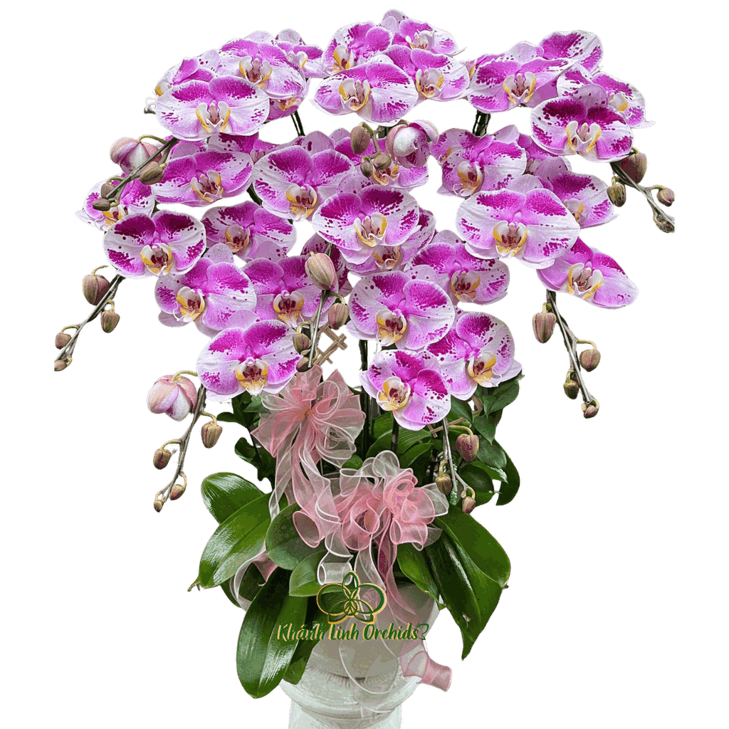 Chậu sứ trắng được chọn làm nền, mang nét đơn giản mà thanh thoát, giúp tôn vinh trọn vẹn vẻ đẹp kiêu sa của những cánh lan đột biến. Màu trắng tượng trưng cho sự tinh khiết và khởi đầu mới, hòa quyện cùng sắc hồng tím của hoa tạo nên thông điệp về tình yêu trọn vẹn, may mắn và niềm tin vào điều tốt đẹp.