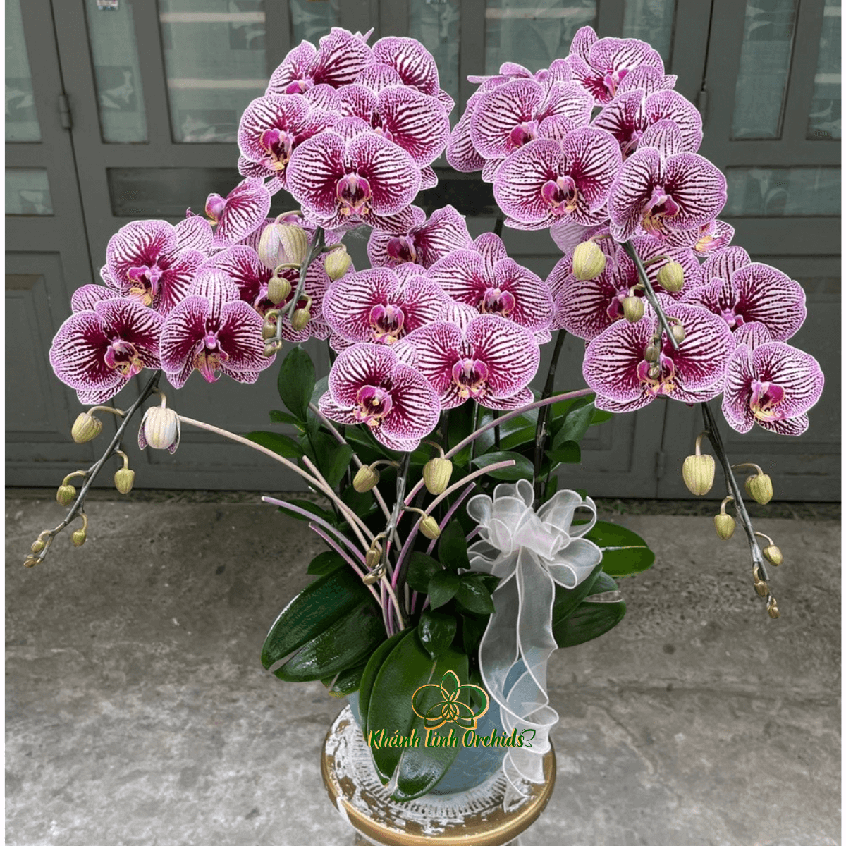 Chậu hoa Lan Hồ Điệp Đột Biến với vẻ đẹp nổi bật và đầy cuốn hút. Những cánh lan sọc tím trắng mềm mại, đều đặn, tạo nên hiệu ứng thị giác ấn tượng và sang trọng. Tông màu tím sọc đặc trưng mang ý nghĩa của sự thủy chung, sâu sắc và bí ẩn, kết hợp hài hòa với sắc trắng viền ngoài – biểu trưng cho sự tinh khiết, thanh cao.