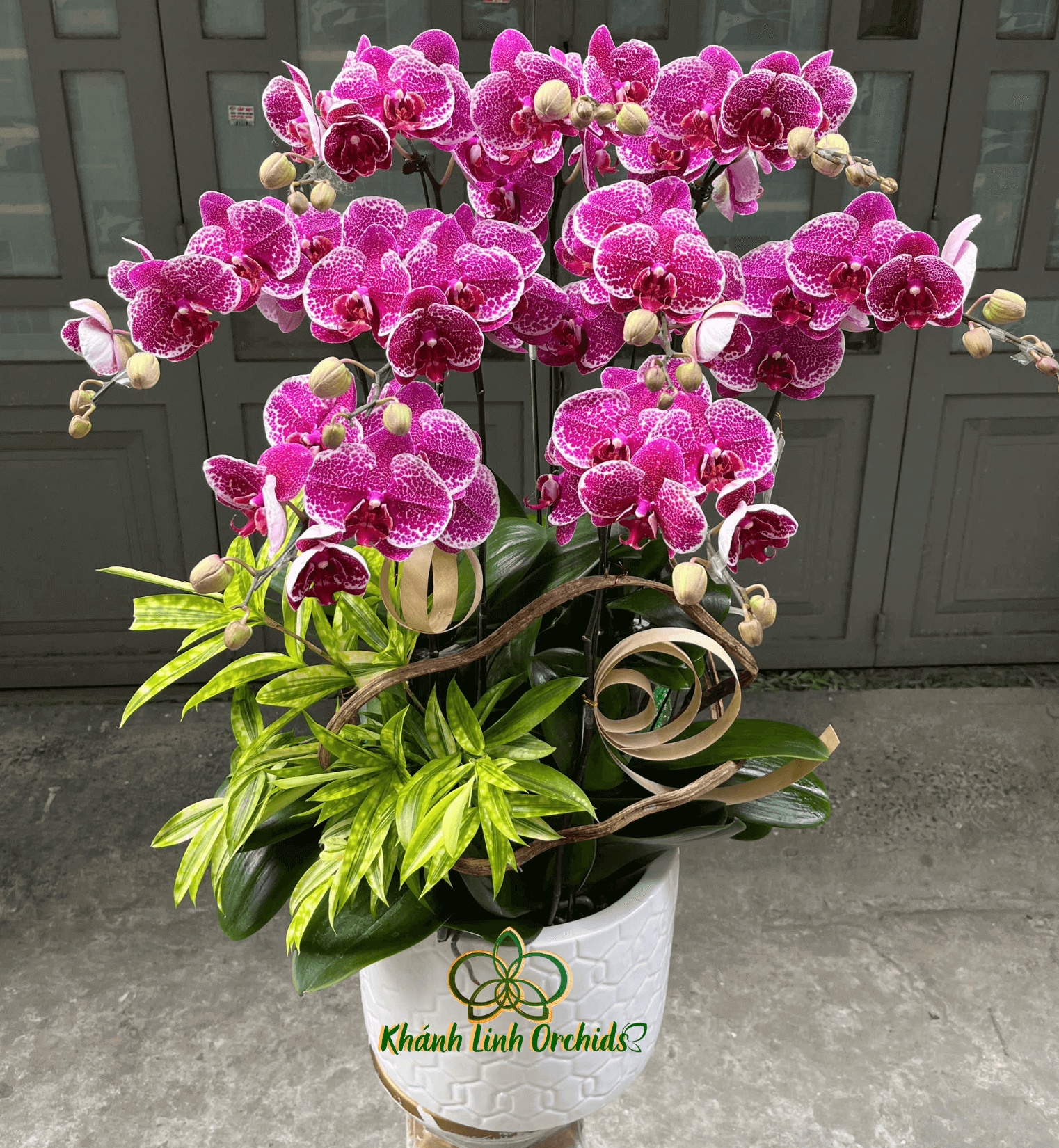Chậu lan được đặt trong bình gốm trắng vân tổ ong sang trọng, kết hợp cùng logo Khánh Linh Orchids như một dấu ấn tinh tế cho sản phẩm chất lượng cao. Tông màu nổi bật giúp chậu hoa trở thành điểm nhấn hoàn hảo trong không gian sống, văn phòng, sảnh tiếp khách hay các buổi lễ quan trọng.