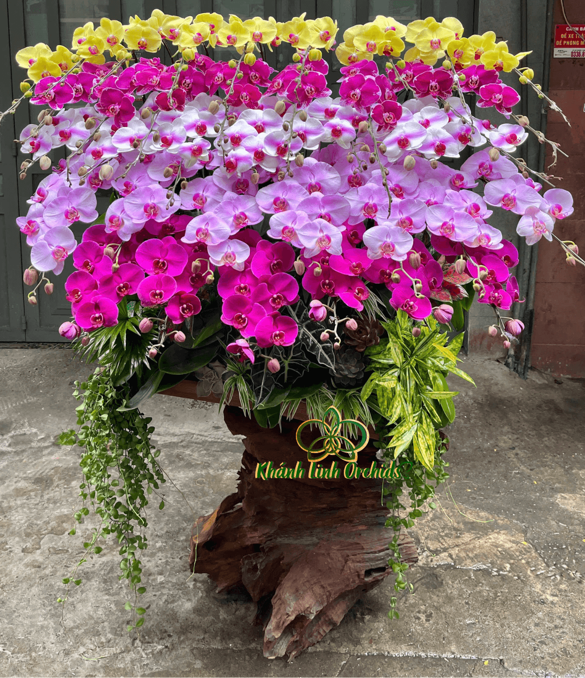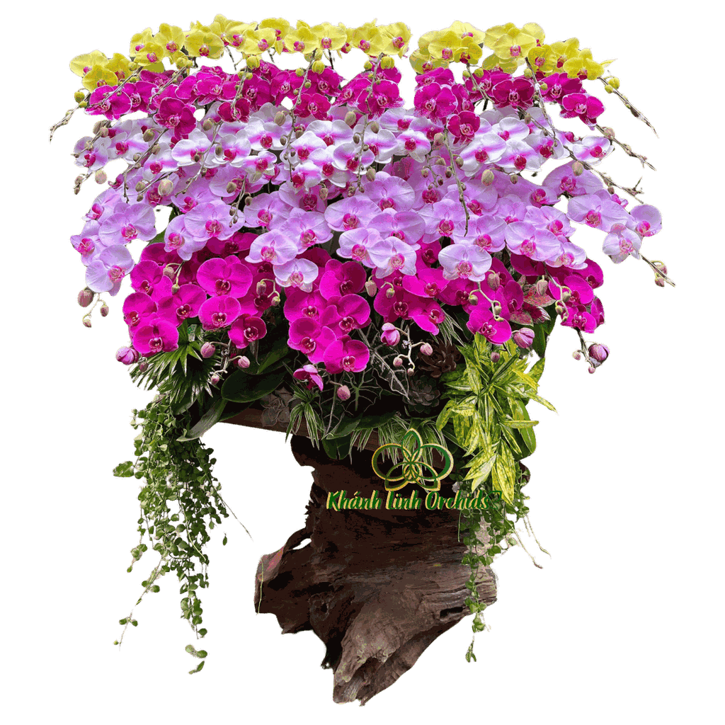 Chậu lan hồ điệp phối 5 màu 37 cành mang đậm dấu ấn tự nhiên và bàn tay khéo léo của người thợ Hoa lan Khánh Linh. Được cắm tinh tế trên nền lũa gỗ tự nhiên, tổng thể chậu hoa mang vẻ đẹp vừa sang trọng, vừa mộc mạc, thể hiện sự hòa quyện giữa sức sống thiên nhiên và nét đẹp nhân tạo đầy tinh tế.