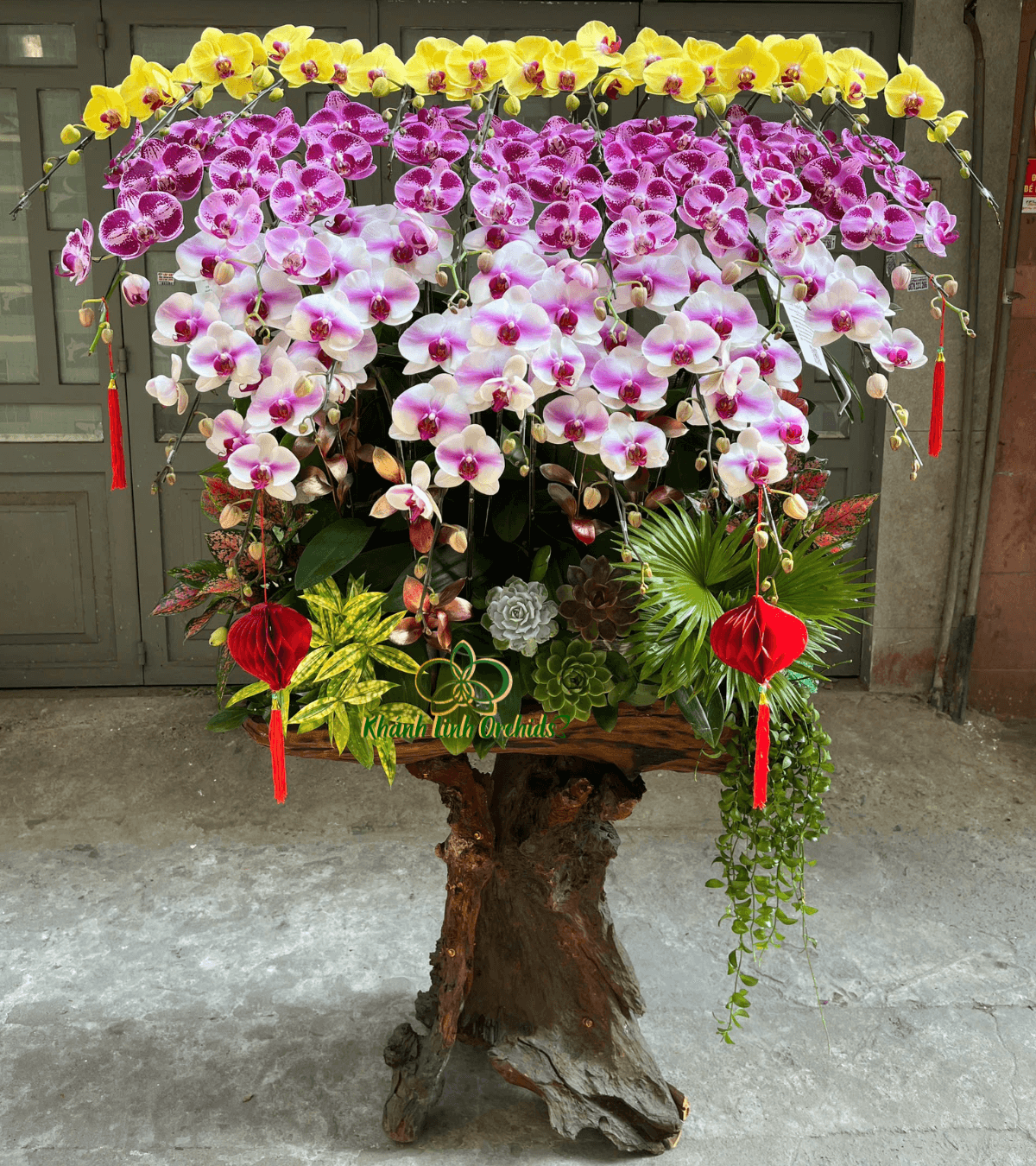 Phần đế gỗ lũa tự nhiên với đường nét mộc mạc, vững chãi làm nền hoàn hảo để tôn lên vẻ đẹp kiêu sa của lan hồ điệp. Gỗ lũa mang đến cảm giác gần gũi với thiên nhiên, đồng thời tạo sự bền vững, trường tồn cho tổng thể chậu hoa. Điểm xuyết xung quanh là sen đá và các loại lá cảnh xanh mướt, góp phần cân bằng bố cục, tăng thêm sức sống và chiều sâu cho tác phẩm. Những chiếc lồng đèn Tết đỏ được trang trí tinh tế không chỉ làm nổi bật không khí lễ hội mà còn mang đến cảm giác ấm áp, may mắn và sung túc.