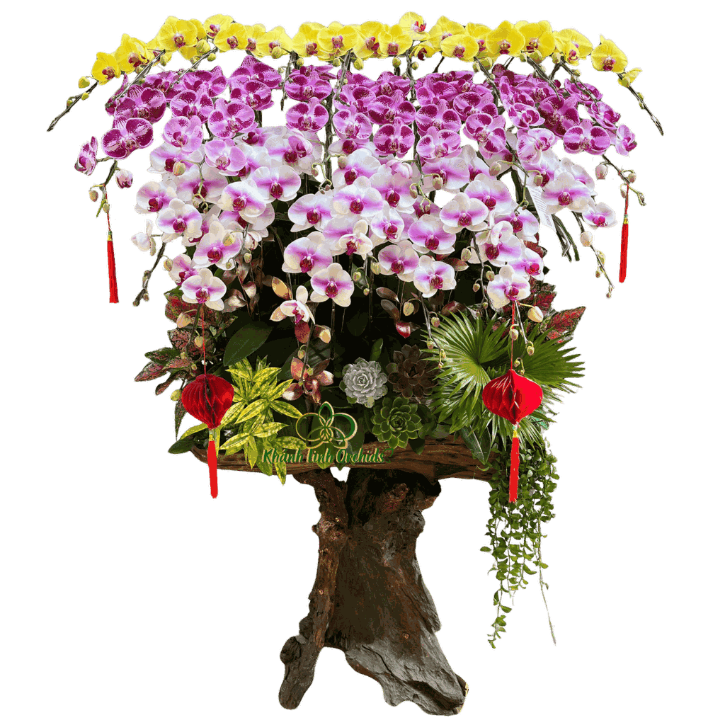 Chậu lan hồ điệp phối màu 25 cành được cắm trên gỗ lũa mang vẻ đẹp rực rỡ, sang trọng và đầy khí xuân. Sự kết hợp hài hòa giữa nhiều gam màu lan hồ điệp như trắng tinh khôi, vàng tươi sáng, hồng tím dịu dàng tạo nên tổng thể sinh động nhưng vẫn cân đối, thể hiện gu thẩm mỹ tinh tế và đẳng cấp. Mỗi cành lan được uốn dáng mềm mại, xếp tầng khéo léo, tạo chiều sâu và cảm giác lan tỏa, thu hút ánh nhìn ngay từ khoảnh khắc đầu tiên.