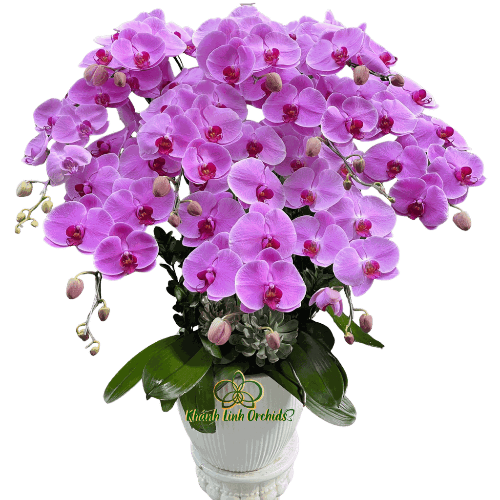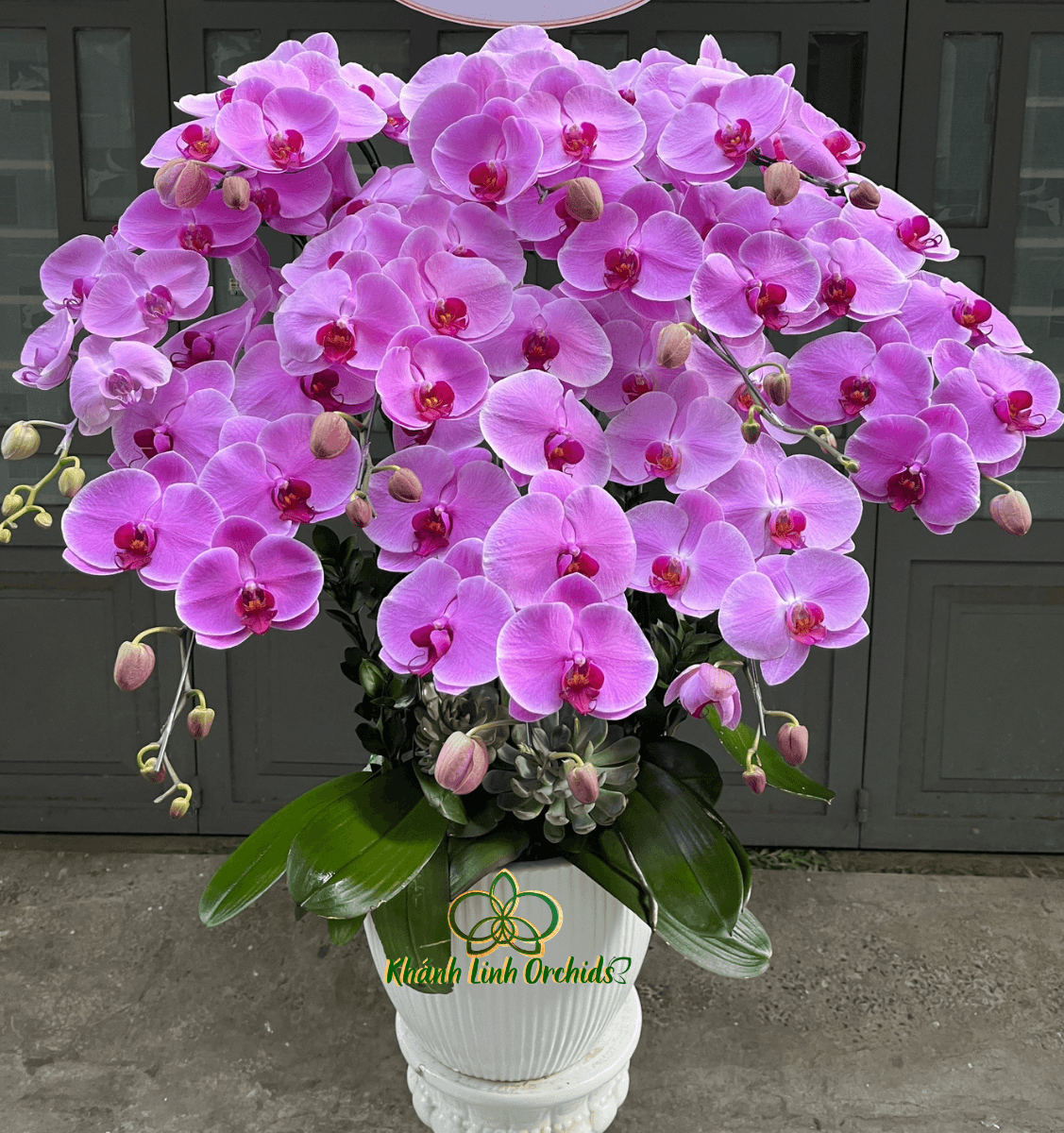 Mười cành lan được sắp xếp theo dáng cong mềm mại, tỏa đều tạo nên bố cục bề thế và đầy đặn. Các cành lan vươn cao rồi rủ nhẹ tự nhiên, giúp tổng thể chậu hoa vừa sang trọng vừa thanh thoát. Với số lượng cành nhiều, chậu lan tạo thành một tán hoa lớn, rực rỡ và nổi bật, rất thích hợp để trưng bày tại phòng khách, sảnh công ty, bàn tiếp khách hoặc những không gian cần điểm nhấn sang trọng.