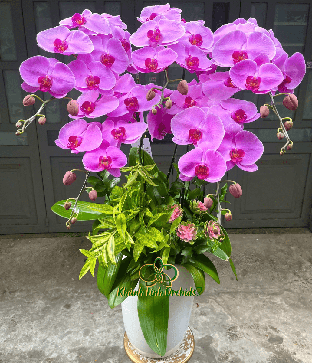 Chậu cao màu trắng mang đến cảm giác sang trọng, hiện đại, giúp nâng tầm tổng thể thiết kế và làm nổi bật vẻ mềm mại của những cánh lan. Sự kết hợp tinh tế giữa lá trúc nhật – biểu tượng của sự kiên cường, thanh cao – và sen đá giả – biểu trưng cho tình cảm bền vững – tạo nên một tác phẩm hoàn chỉnh, vừa đẹp về mặt thẩm mỹ vừa giàu ý nghĩa. Đây là chậu hoa lý tưởng để làm điểm nhấn cho không gian sống, phòng làm việc hay gửi gắm thông điệp yêu thương đến những người đặc biệt.