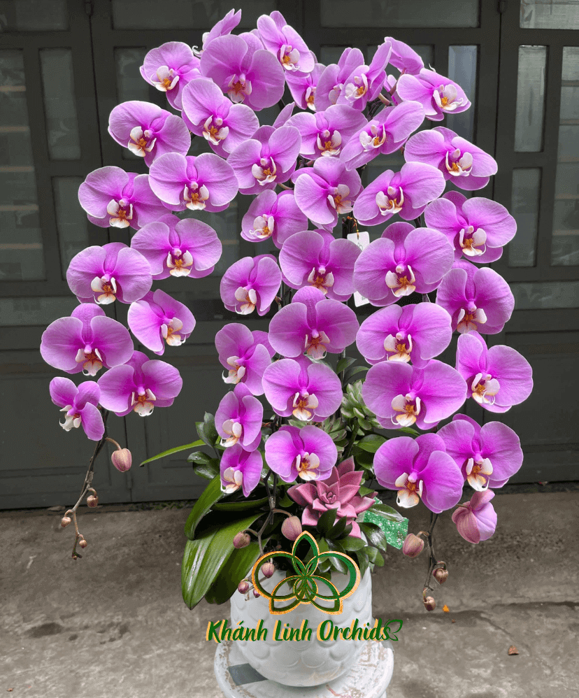 Chậu lan còn được trang trí bằng sen đá phun màu hồng ở gốc chậu, làm điểm nhấn nổi bật, mang đến vẻ đẹp hài hòa mà không kém phần đẳng cấp cho tổng thể.