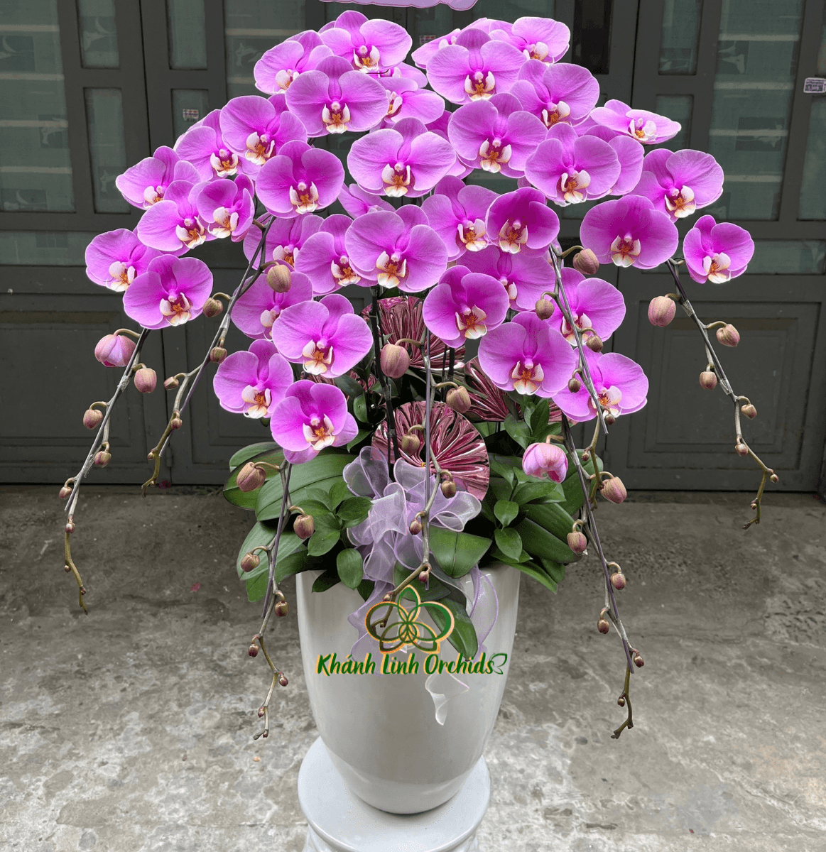 Các cành lan được bố trí theo dáng tỏa rộng, uốn cong nhẹ xuống tạo hiệu ứng rủ tự nhiên. Sắc hồng anna đặc trưng hiện lên tươi tắn nhưng không quá rực, mang độ chuyển màu nhẹ nhàng từ cánh đến nhuỵ hoa, tạo chiều sâu và cảm giác rất “dịu mắt” khi ngắm nhìn. Những bông hoa nở đều, cánh tròn đầy, mịn màng, xen kẽ cùng các nụ còn chúm chím như giữ lại nét duyên e ấp, làm cho tổng thể trở nên sống động và có nhịp điệu.