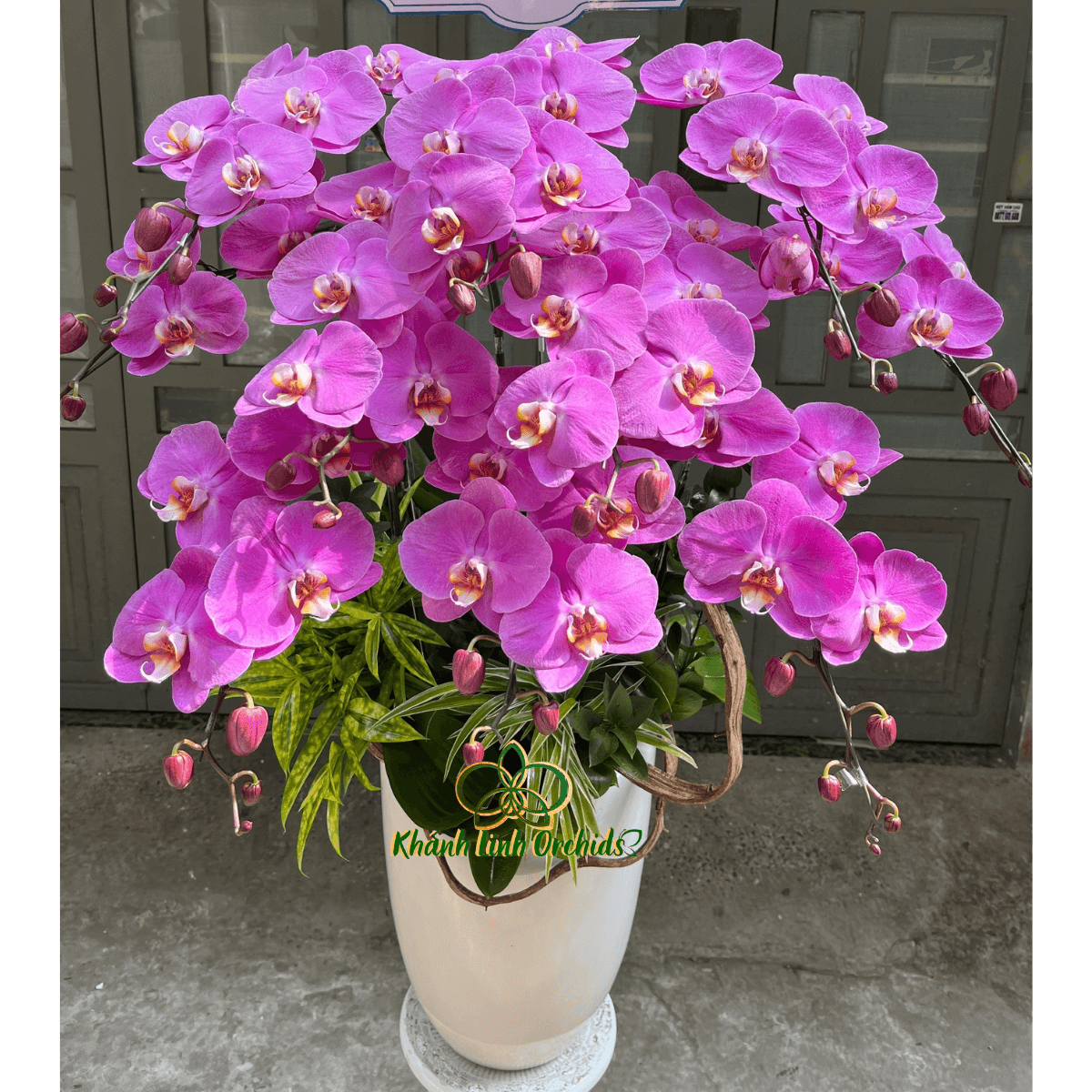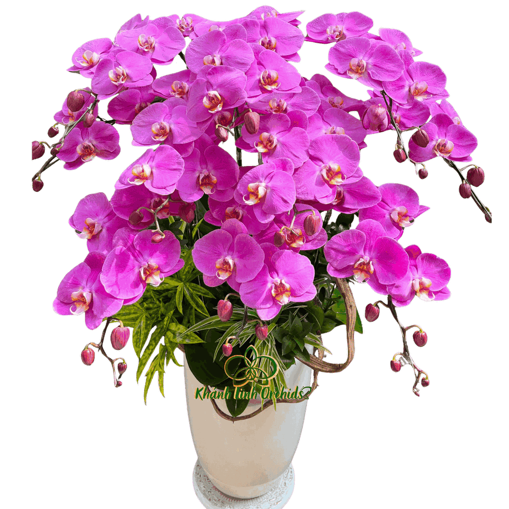 Chậu lan hồ điệp hồng 10 cành được cắm trong chậu sứ trắng cao sang trọng, mang vẻ đẹp quyến rũ, thanh thoát và đầy sức sống. Mỗi cánh hoa hồng phớt ánh tím như gợi lên sự dịu dàng, ngọt ngào nhưng vẫn toát lên thần thái quý phái và trang nhã.