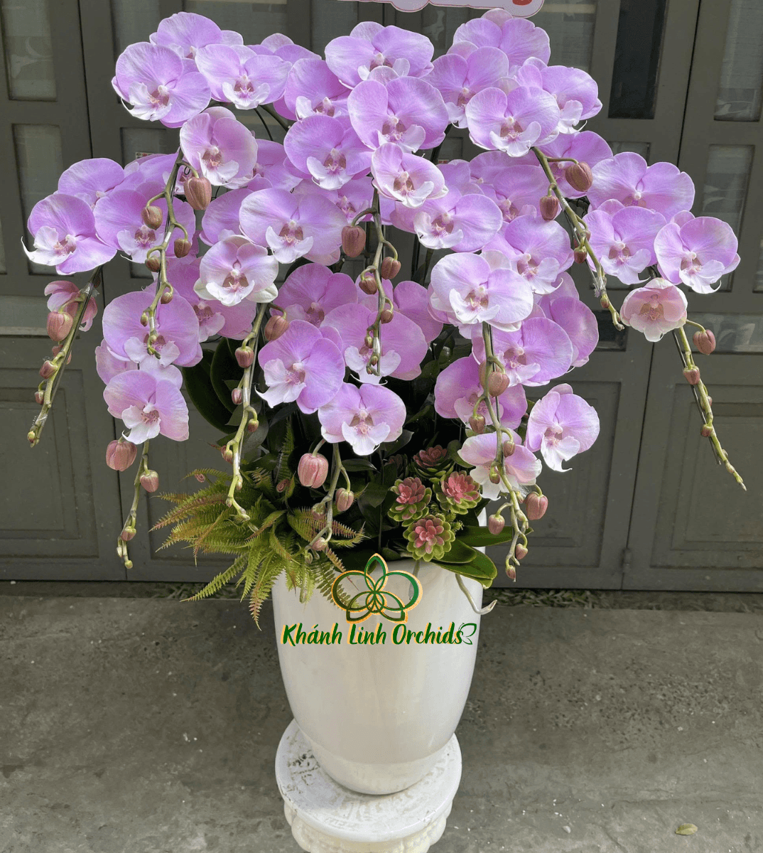 Phần gốc chậu được trang trí tinh tế với sen đá giả và dương xỉ giả, tạo nên điểm nhấn sinh động và tự nhiên cho tổng thể chậu lan. Những cụm sen đá nhỏ xinh mang dáng vẻ chắc khỏe, kết hợp cùng các nhánh dương xỉ mềm mại giúp phần chân chậu trở nên hài hòa và giàu sức sống. Sự kết hợp này không chỉ làm tăng giá trị thẩm mỹ mà còn giúp chậu lan trông đầy đặn và nghệ thuật hơn.