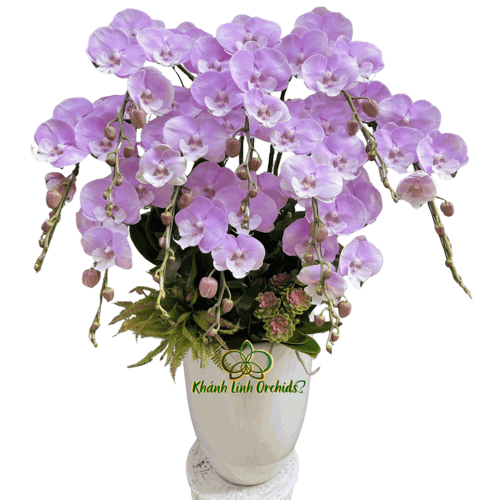 Chậu lan gồm 10 cành được sắp xếp khéo léo theo dáng cong tự nhiên, tỏa đều và mềm mại, tạo nên một tán hoa rộng và đầy đặn. Khi các cành lan cùng nở rộ, chúng tạo thành một tổng thể hài hòa, sang trọng và rất bắt mắt. Xen giữa những bông hoa đang nở là các nụ hoa tròn căng, hứa hẹn tiếp tục bung nở trong những ngày tiếp theo, giúp chậu lan luôn giữ được vẻ tươi mới và kéo dài thời gian thưởng hoa.