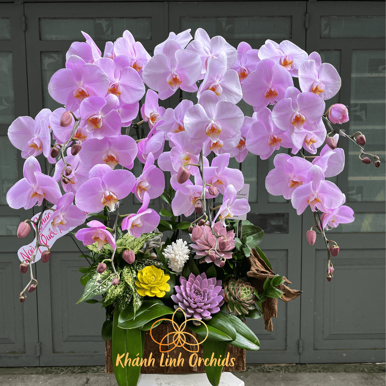 Chậu hoa Lan Hồ Điệp hồng phấn với 7 cành hoa duyên dáng tạo nên một tổng thể tươi sáng, ngọt ngào và dịu dàng, thể hiện vẻ đẹp nữ tính, đằm thắm. Mỗi cành hoa với sắc hồng nhẹ nhàng, hòa quyện tự nhiên và tỏa sáng như nụ cười ấm áp của buổi sớm mai. Hoa được cắm trong một chiếc hộp gỗ đơn giản nhưng sang trọng, màu sắc tự nhiên của gỗ làm nổi bật lên sắc hồng phấn, tạo sự thanh lịch cho cả chậu hoa. Điểm xuyết quanh gốc là những cây sen đá phun màu cùng tone, tạo sự đồng điệu và góp phần tăng thêm độ sâu sắc cho chậu hoa, như mang một cảm giác gần gũi và ấm áp.