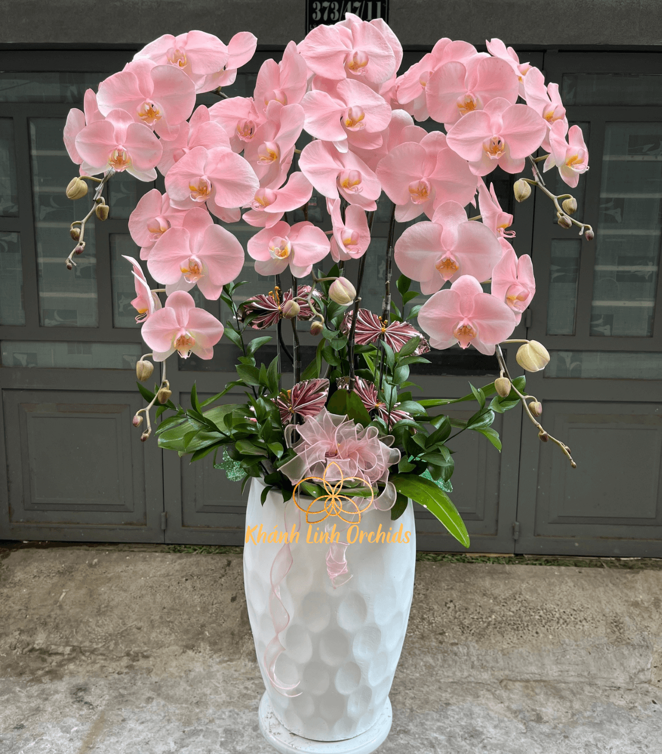 Chậu lập phương cao cấp với sắc trắng và thiết kế tối giản làm nền, tôn vinh vẻ đẹp tinh tế của những đóa hoa. Sự kết hợp này khiến chậu hoa trở nên nổi bật và cuốn hút, thích hợp làm điểm nhấn cho không gian sống thêm phần thanh lịch và đẳng cấp. Lan Hồ Điệp hồng pastel không chỉ là loài hoa trang trí mà còn mang đến sự ấm áp, nhẹ nhàng, làm mềm mại mọi ánh nhìn.