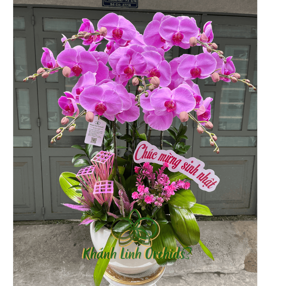 Màu sắc hồng phấn như những làn sóng nhẹ nhàng lan tỏa, tạo ra một không gian ấm cúng và thư thái. Sự sắp xếp bố cục của chậu hoa được nghệ nhân từ nhà Hoa lan Khánh Linh làm nổi bật dáng vẻ duyên dáng và thanh lịch của từng cành lan, đồng thời tạo nên một tổng thể hài hòa và cuốn hút.