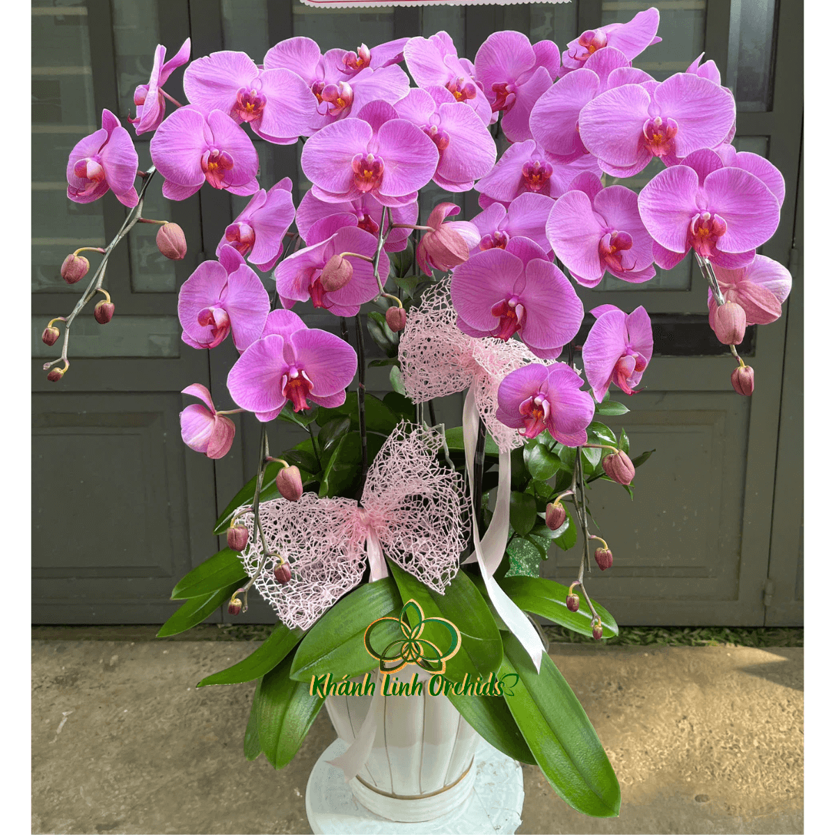 Các cành lan được cắm khéo léo trong chậu sứ trắng thấp với thiết kế đơn giản, hiện đại, làm nổi bật màu sắc của hoa và giúp tôn lên vẻ đẹp trang nhã, tinh tế. Điểm nhấn đặc biệt trên chậu hoa chính là hai chiếc nơ hồng được buộc gọn gàng trên thân cành lan, vừa mang đến sự duyên dáng, nữ tính, vừa tạo cảm giác như hoa đang được nâng niu, chăm chút kỹ lưỡng.
