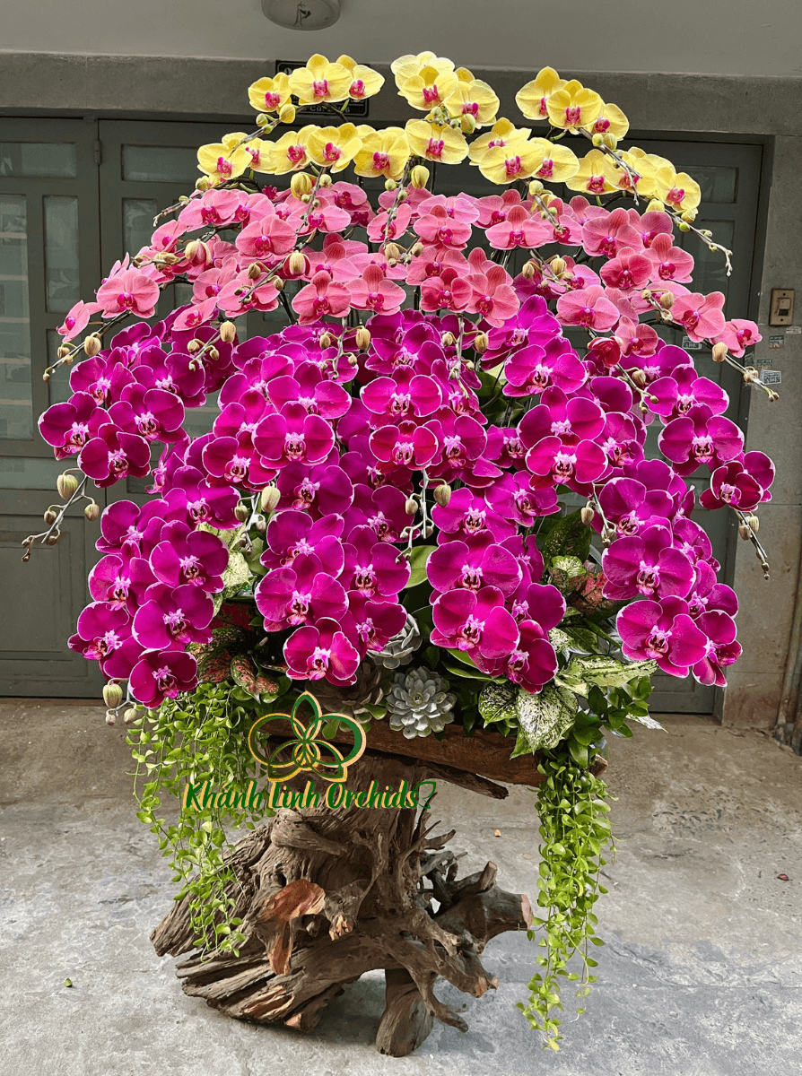 Chậu lan nổi bật với sự kết hợp của ba tông màu vàng, đỏ cam và tím. Sắc vàng mang lại cảm giác tươi sáng, thu hút ánh nhìn ngay từ cái nhìn đầu tiên. Màu đỏ cam tạo nên nét mềm mại, nhẹ nhàng và dễ chịu. Trong khi đó, màu tím giúp tổng thể trở nên trầm ổn và thể hiện sự sang trọng. Ba gam màu được bố trí cân đối, đan xen hợp lý, tạo nên một tổng thể hài hòa và cuốn hút.