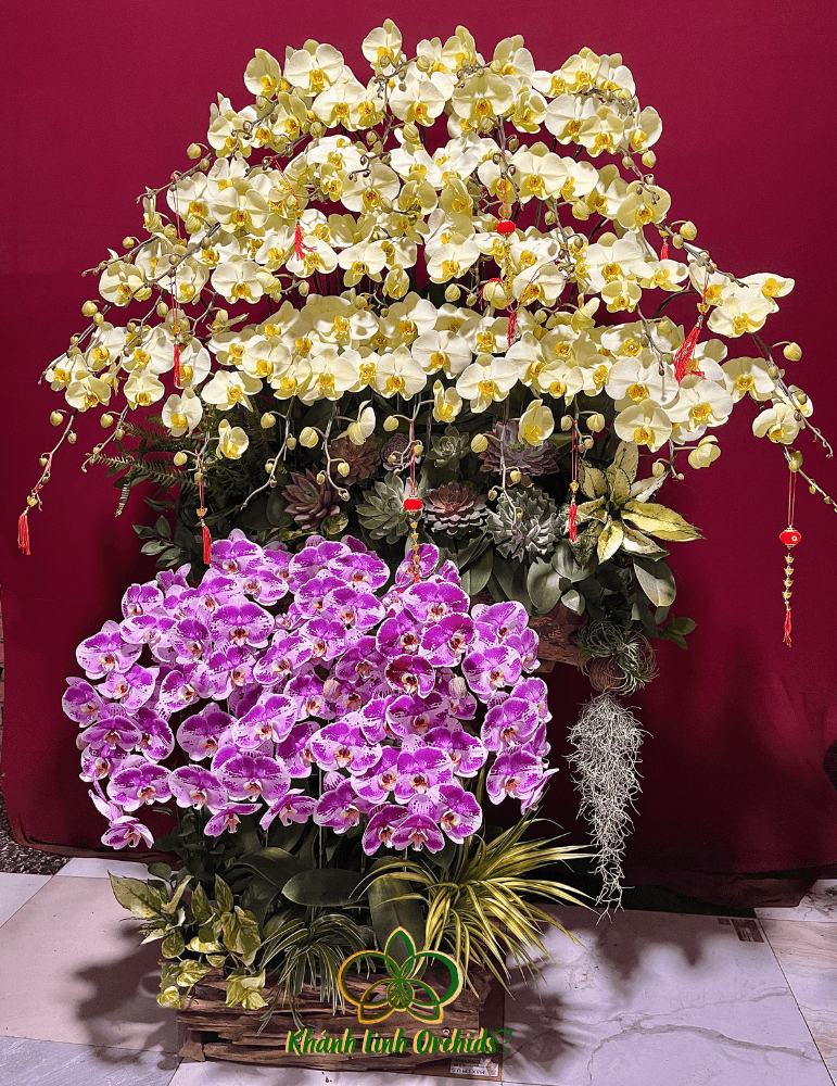 Chậu hoa Lan Hồ Điệp Lũa Gỗ Phối Màu Nhị Sắc 45 Cành là một tác phẩm nghệ thuật mang vẻ đẹp hoàn hảo và đầy sức hút, thể hiện sự kết hợp độc đáo giữa hai gam màu sắc tinh tế và ý nghĩa sâu sắc. Sắc xanh bơ ngọt ngào, tươi mát, tượng trưng cho sự ấm no, thịnh vượng và thuận hòa trong cuộc sống. Màu sắc này mang đến một cảm giác nhẹ nhàng, dễ chịu và đầy hy vọng. Trong khi đó, sắc tím đột biến mạnh mẽ, với độ đậm sang trọng, tạo ra sự quý phái và lộng lẫy, làm toát lên vẻ đẹp độc đáo và đầy sức cuốn hút của từng cánh hoa. Sự kết hợp giữa hai màu sắc này không chỉ mang lại vẻ đẹp hài hòa mà còn là biểu tượng của sự may mắn, thành công và sự thịnh vượng.