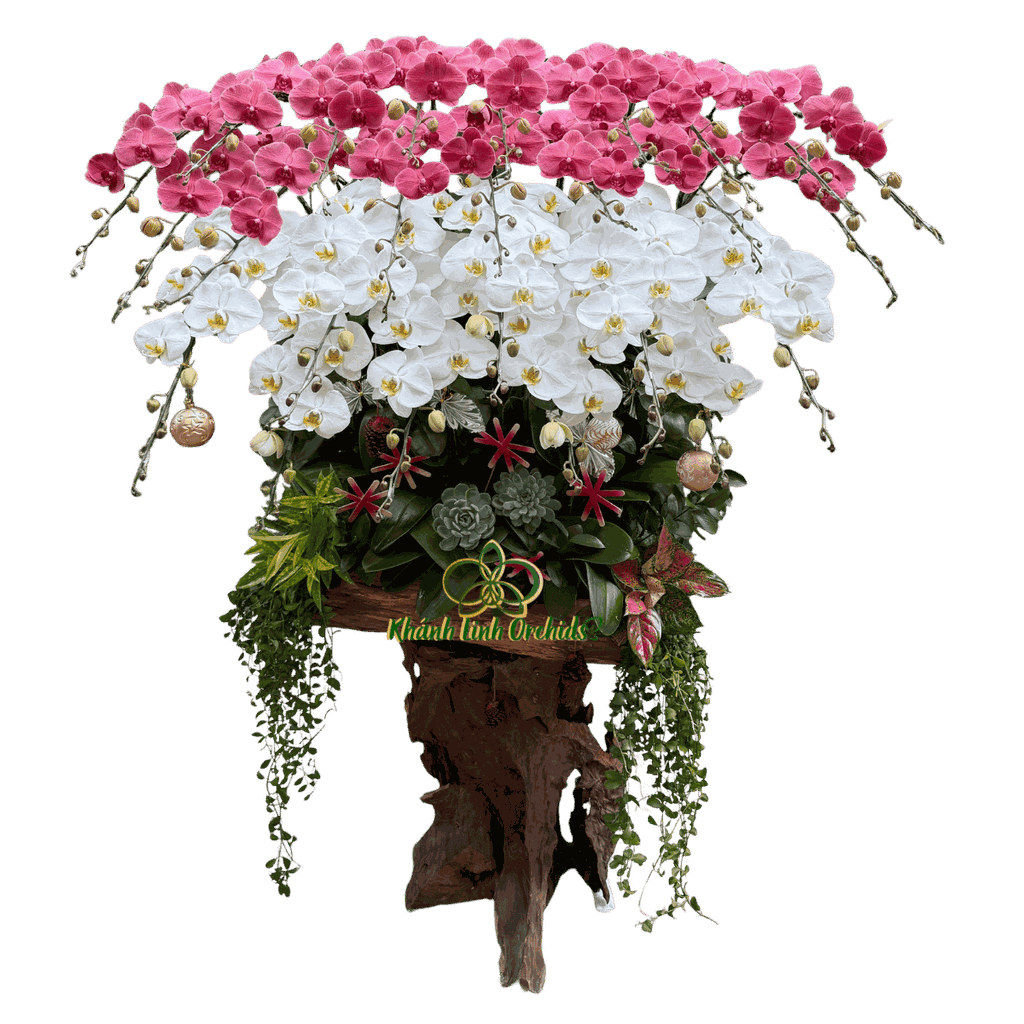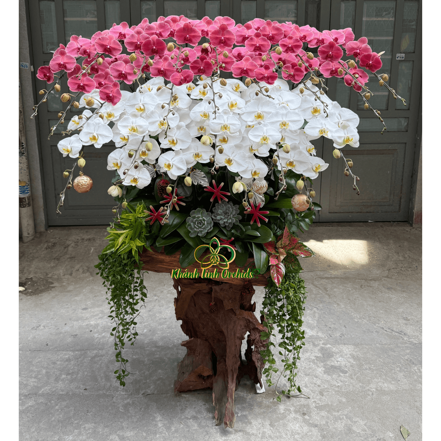 Chậu lan hồ điệp trắng phối đỏ cam 25 cành là một tác phẩm mang đậm dấu ấn nghệ thuật, được thiết kế trên nền lũa gỗ tự nhiên đầy tính thẩm mỹ. Sự kết hợp của hai gam màu nổi bật – trắng tinh khôi và đỏ cam rực rỡ – tạo nên một tổng thể vừa trang nhã, vừa cuốn hút, phù hợp trưng bày trong các không gian sang trọng hoặc làm quà tặng cao cấp dịp khai trương, tân gia, lễ Tết.