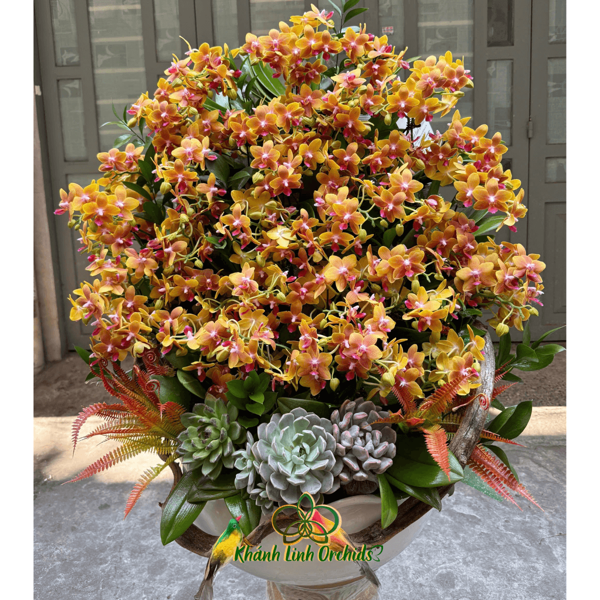 Phần chân chậu được điểm xuyết bằng những cây sen đá nhỏ xanh mướt, vừa tạo sự cân bằng trong bố cục, vừa mang đến cảm giác gần gũi với thiên nhiên. Sen đá cũng là biểu tượng cho sự bền vững, trường tồn và sức sống mãnh liệt – hài hòa hoàn hảo với năng lượng tươi mới của hoa lan.