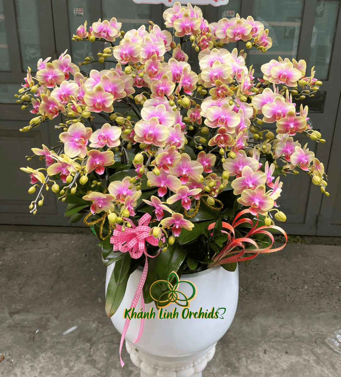 Chậu lan được đặt trong chậu sứ trắng thấp với thiết kế đơn giản và thanh lịch. Màu trắng của chậu giúp làm nổi bật sắc hồng của hoa lan phía trên, đồng thời tạo cảm giác nhẹ nhàng và tinh tế cho tổng thể. Dáng chậu thấp giúp bố cục chậu lan trở nên gọn gàng, phù hợp để trưng bày trên bàn, kệ trang trí, quầy lễ tân hoặc bàn làm việc.