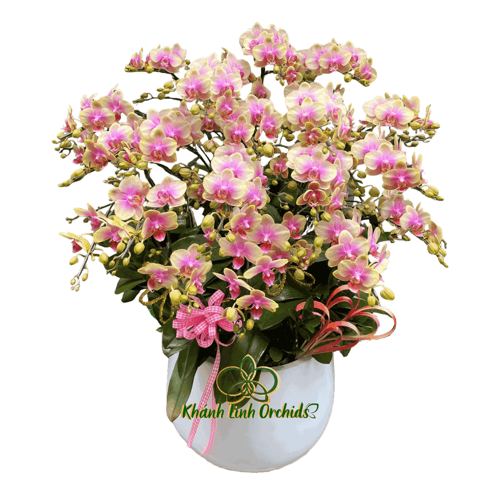 Chậu lan hồ điệp mini hồng 10 gốc 2 vòi mang phong cách nhẹ nhàng và tinh tế, phù hợp với nhiều không gian trang trí khác nhau. Tổng thể chậu lan được thiết kế hài hòa giữa sắc hoa dịu dàng, cách sắp xếp gọn gàng và các chi tiết trang trí mang tính thẩm mỹ, tạo nên một sản phẩm hoa lan vừa thanh lịch vừa ấm áp.