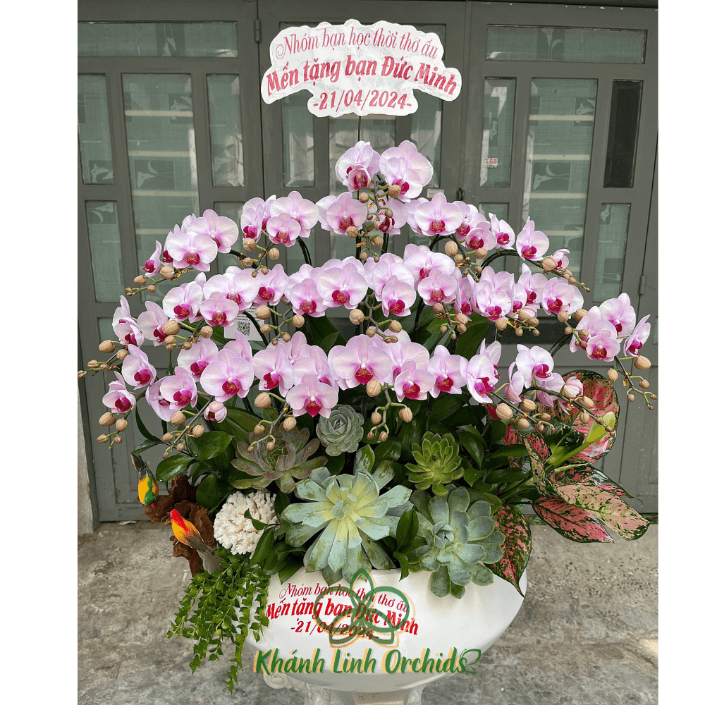 Chậu hoa được cắm trong chậu composite thấp cao cấp, với thiết kế đơn giản nhưng sang trọng. Màu trắng của chậu tạo sự tương phản dịu nhẹ với sắc hồng ngọt ngào của lan, làm tôn lên vẻ đẹp thanh thoát và tinh tế của từng bông hoa. Phía dưới, sen đá được trang trí đầy cả gốc, với những tông màu xanh mát hài hòa, đồng thời làm nổi bật thêm vẻ đẹp mềm mại, mong manh của những cành lan.