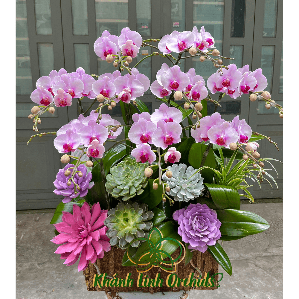 Chậu hoa lan hồ điệp mini hồng còn được trang trí thêm những cây sen đá phun màu, làm điểm nhấn độc đáo cho tổng thể. Sen đá với những sắc màu tươi sáng, được bố trí khéo léo xung quanh các cành lan, như những ngôi sao nhỏ tô điểm thêm cho bức tranh thiên nhiên. Sự kết hợp giữa lan hồ điệp hồng và sen đá phun màu tạo nên một tổng thể hài hòa, vừa có sự nhẹ nhàng của lan, lại vừa mang nét tươi mới, sống động từ sen đá. Chúng tạo nên một tác phẩm nghệ thuật đầy màu sắc, khiến không gian trở nên sinh động và giàu cảm xúc hơn.