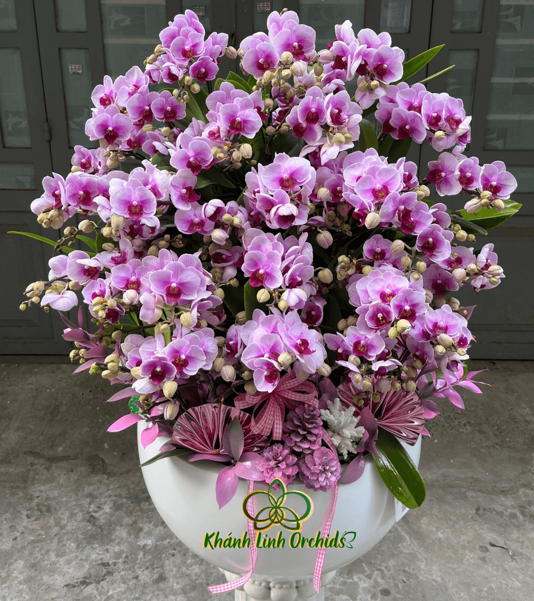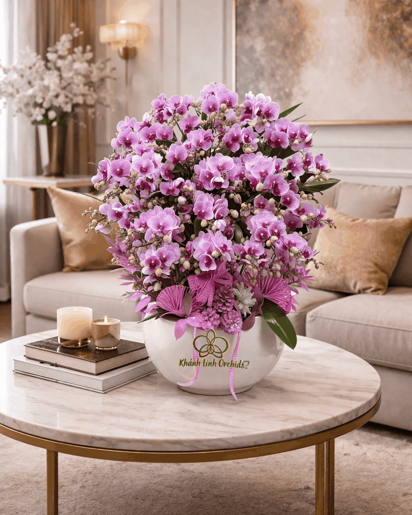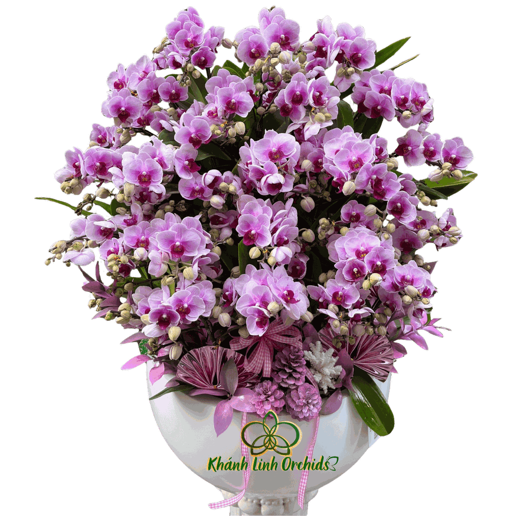 Những bông lan mini sở hữu sắc tím pha hồng dịu mắt, cánh hoa nhỏ nhắn, mềm mại và đều đặn. Phần nhuỵ hoa đậm màu tạo điểm nhấn rõ ràng, giúp từng bông nổi bật trên nền tổng thể. Các cành lan đan xen giữa hoa nở và nụ, mang lại sự sinh động và giữ cho chậu hoa luôn có sức hút trong thời gian dài.