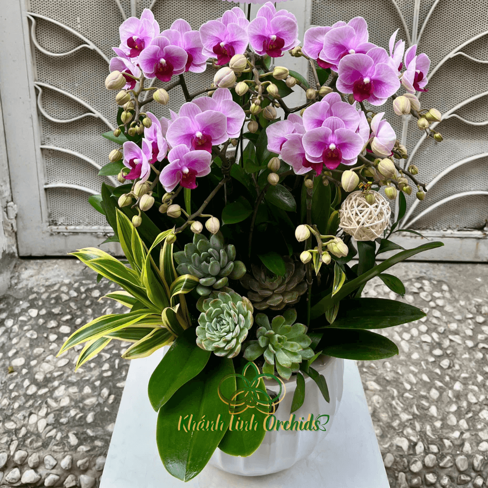 Năm cành lan được khéo léo sắp đặt trong một chậu trắng thấp, làm nổi bật sắc tím rực rỡ của hoa, đồng thời tạo nên sự cân đối, thanh thoát cho tổng thể. Màu trắng tinh khôi của chậu mang đến sự nhã nhặn, hiện đại, giúp chậu hoa dễ dàng hòa hợp với nhiều không gian trang trí khác nhau. Để tăng thêm vẻ sinh động và tự nhiên, chậu hoa còn được trang trí với sen đá, tạo điểm nhấn xanh tươi, cân bằng màu sắc, giúp tổng thể trở nên hài hòa hơn. Những cây sen đá nhỏ xinh không chỉ làm nền cho hoa lan thêm nổi bật mà còn mang ý nghĩa phong thủy về sự bền vững, may mắn và tài lộc.