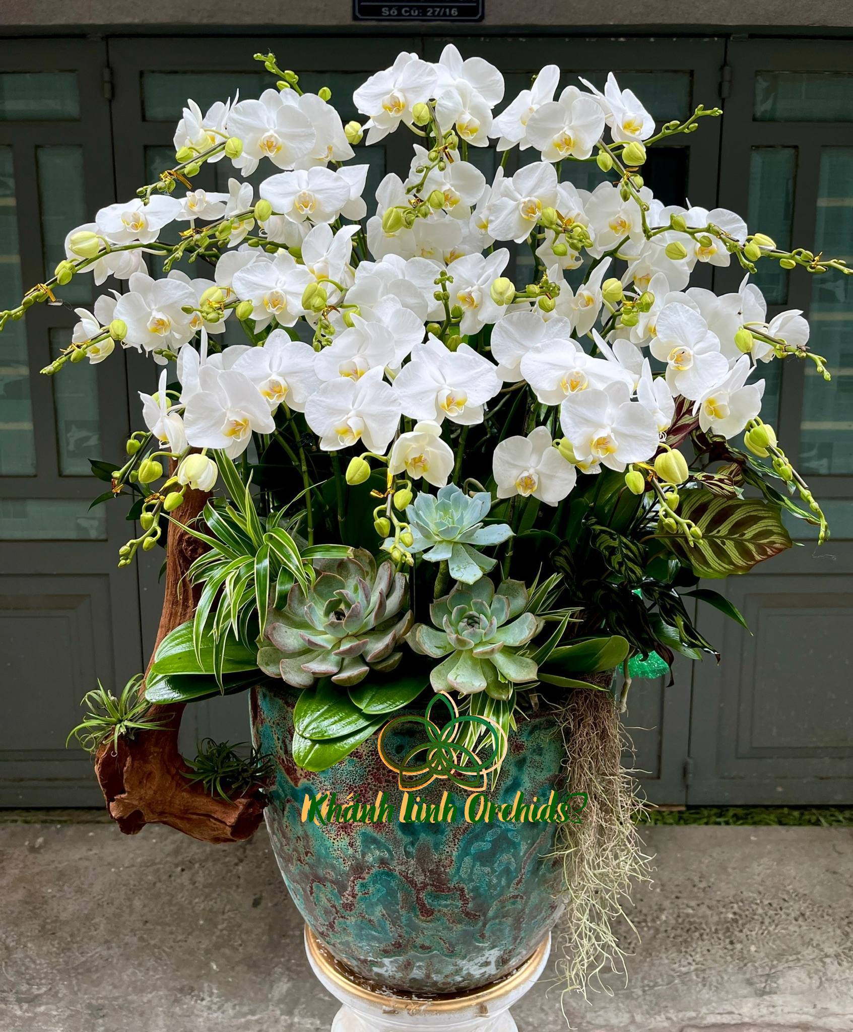 Tất cả được đặt trong chậu đá mài nổi cao cấp với sắc xanh indochine sang trọng, làm nổi bật sự tinh tế của những cành lan. Chậu đá mài không chỉ vững chãi mà còn tạo nên một điểm nhấn độc đáo, hiện đại, góp phần tôn lên vẻ đẹp tổng thể của chậu lan.