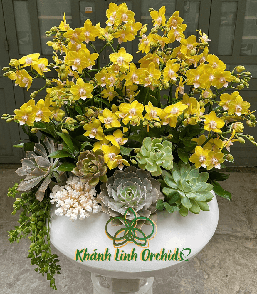 Mười gốc lan, hai vòi được phân ra thành 20 nhánh cắm một cách khéo léo trong một chậu xi măng trắng thấp, tạo nên sự kết hợp giữa nét hiện đại và vẻ đẹp mộc mạc. Màu trắng của chậu làm nền hoàn hảo để sắc vàng của hoa lan thêm phần nổi bật, mang đến cảm giác trang nhã và tinh tế. Để tăng thêm tính tự nhiên và nghệ thuật, chậu hoa được trang trí với lá rũ xanh mềm mại, san hô khô và sen đá, tạo nên một tiểu cảnh đầy sức sống. Những nhánh lá rũ nhẹ nhàng buông xuống mang lại sự mềm mại, uyển chuyển, trong khi san hô khô với hình dáng độc đáo gợi cảm giác gần gũi với thiên nhiên. Những cây sen đá nhỏ nhắn xen kẽ tạo sự cân bằng, giúp tổng thể chậu hoa thêm phần hài hòa và sinh động.