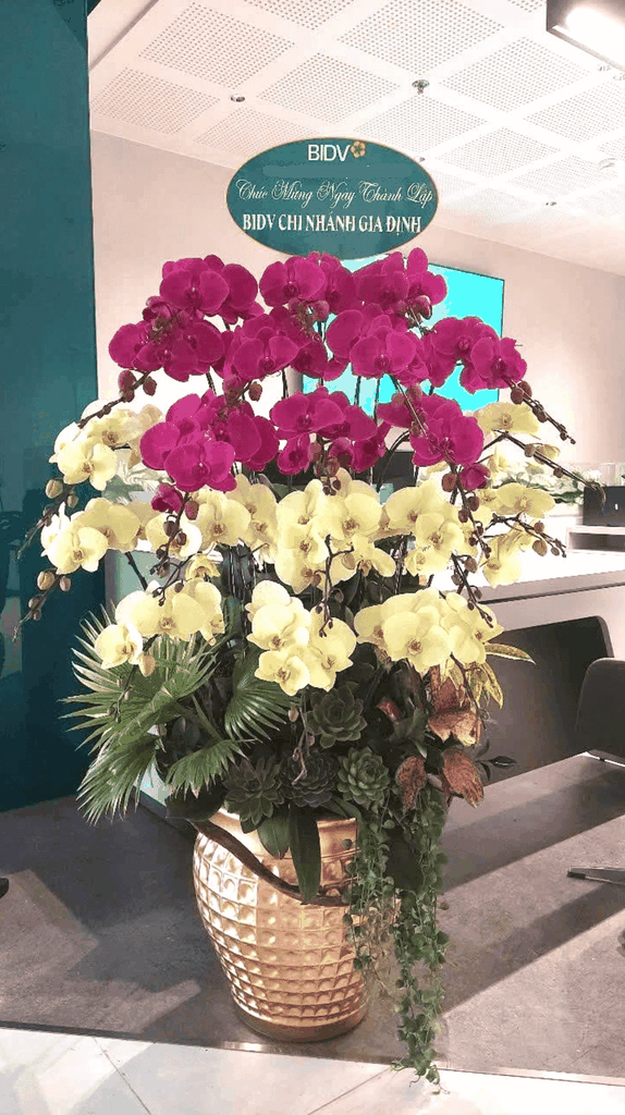 20 cành hoa được bố trí cân đối, tầng hoa mềm mại, uyển chuyển, tạo nên một tổng thể hài hòa và đầy ấn tượng. Phần tiểu cảnh kết hợp lá xanh, sen đá và phụ kiện trang trí càng làm nổi bật nét sang trọng, giúp chậu hoa trở nên bắt mắt trong mọi không gian.