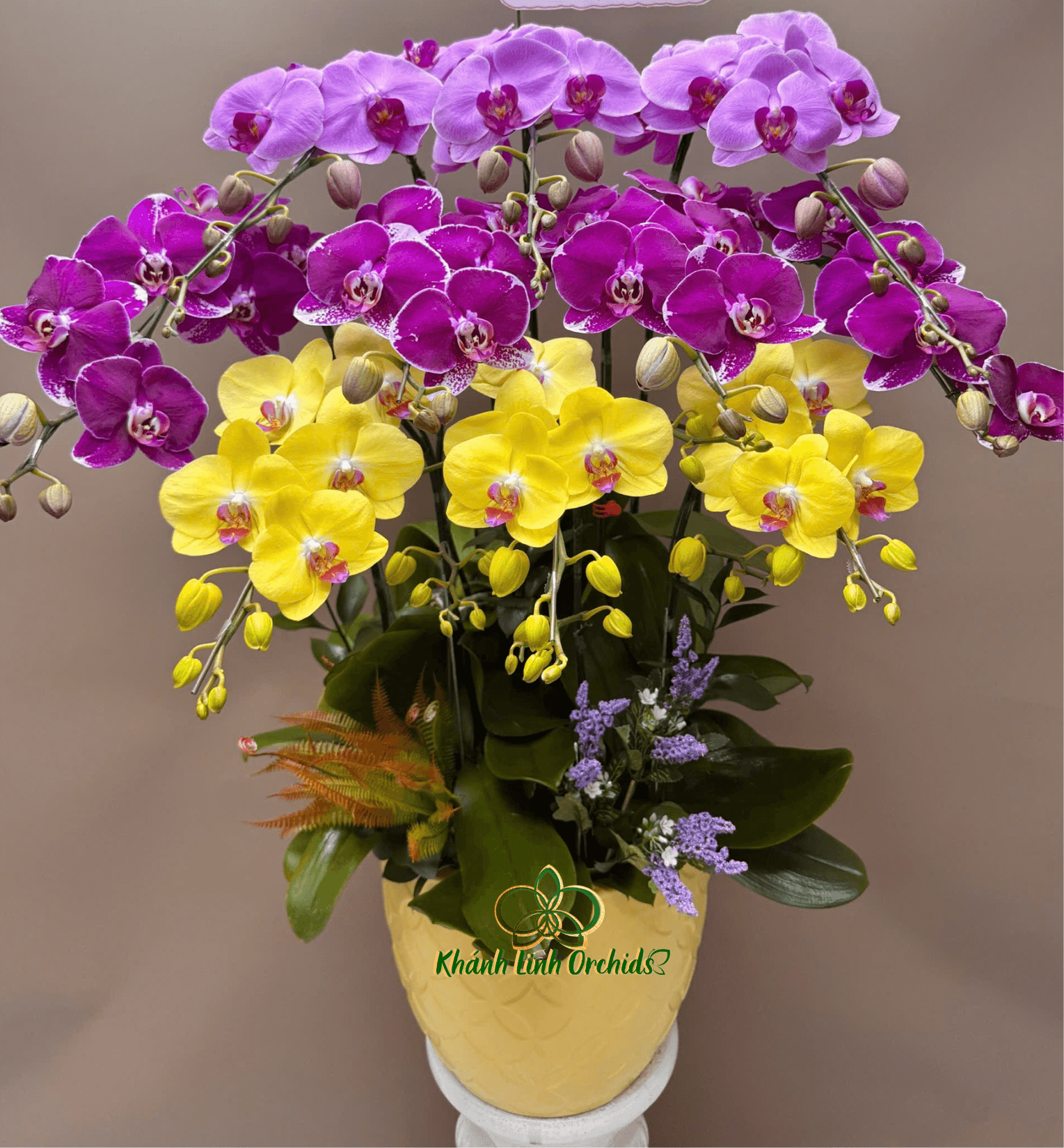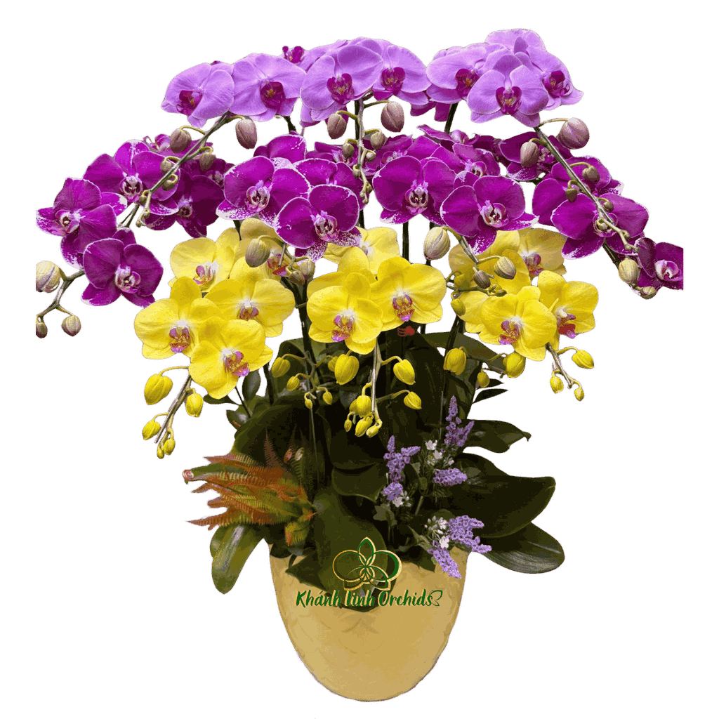 Chậu hoa lan hồ điệp phối 3 màu 10 cành là sự kết hợp của ba gam màu nổi bật: tím đậm, tím nhạt và vàng chanh. Mỗi cành hoa được lựa chọn kỹ lưỡng, hoa nở đều, cánh dày, form tròn đẹp mắt. Chậu gồm 10 cành lan hồ điệp khỏe mạnh, nụ và hoa xen kẽ giúp thời gian trưng bày kéo dài.
