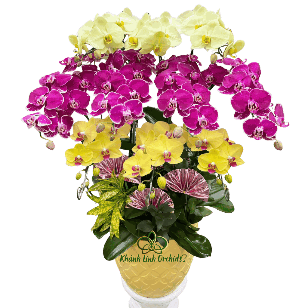 Chậu Lan Hồ Điệp Phối 3 Màu 10 Cành tại Hoa Lan Khánh Linh là sự kết hợp hài hòa giữa ba gam màu nổi bật: vàng tươi rạng rỡ, tím đột biến sang trọng và xanh bơ tinh khôi. Mỗi cành hoa vươn mình kiêu hãnh, tỏa sắc trong không gian, mang đến vẻ đẹp tràn đầy năng lượng, vừa ấm áp vừa thanh lịch.